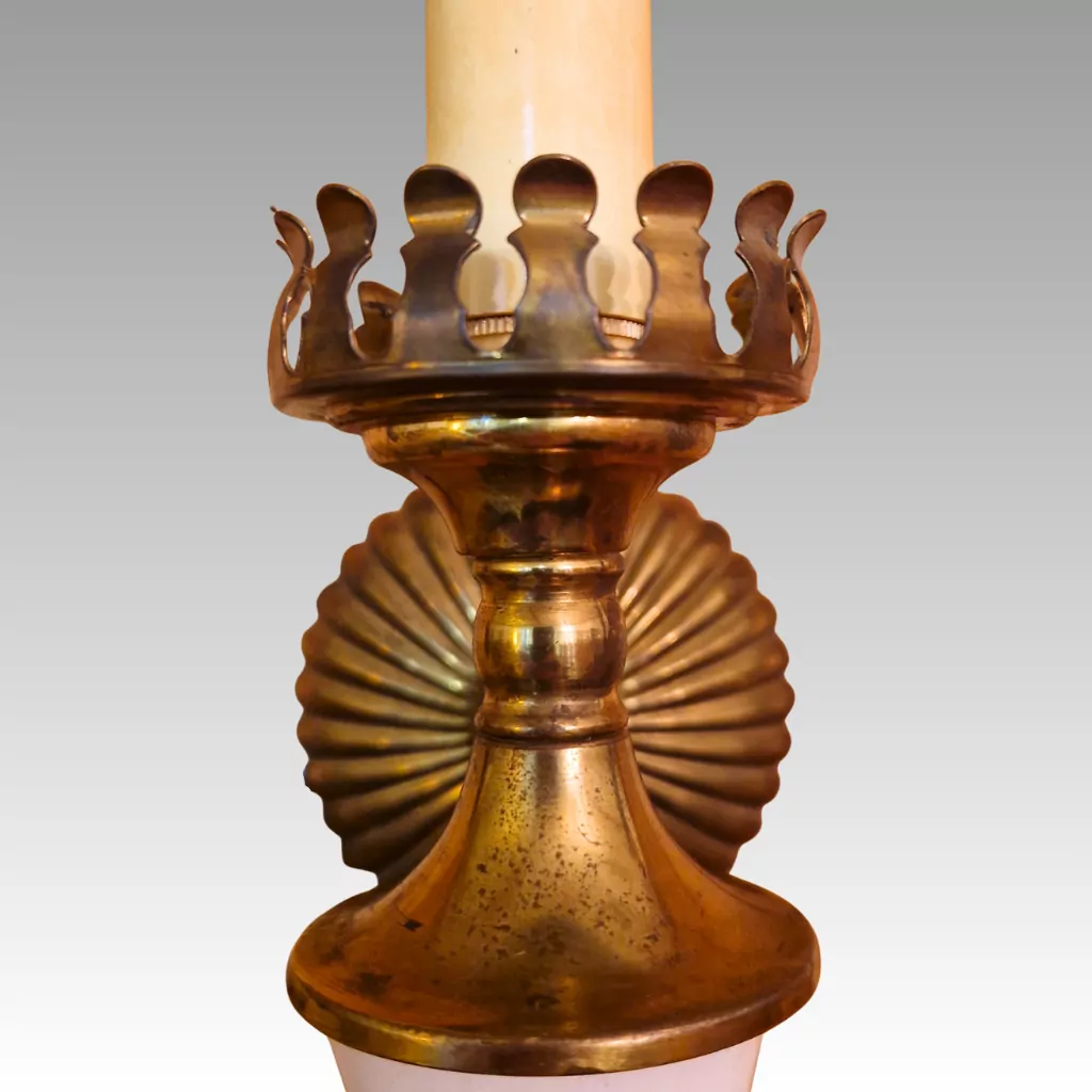 Diese 2 außergewöhnlichen Jugendstil Wandlampen Messing verkörpern die stilvolle Wohnkultur des Jugendstils auf besonders schöne Weise. Die Wandlampen präsentieren sich als originales Paar und bestechen durch ihre harmonischen Proportionen, die warme Ausstrahlung des Messings und die dekorativen Details. Besonders charakteristisch ist die fein ausgearbeitete Wandrosette in Muschelform, die den historistischen Ursprung der Leuchten unterstreicht und ihnen eine elegante Präsenz verleiht.