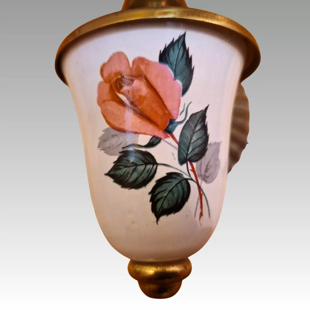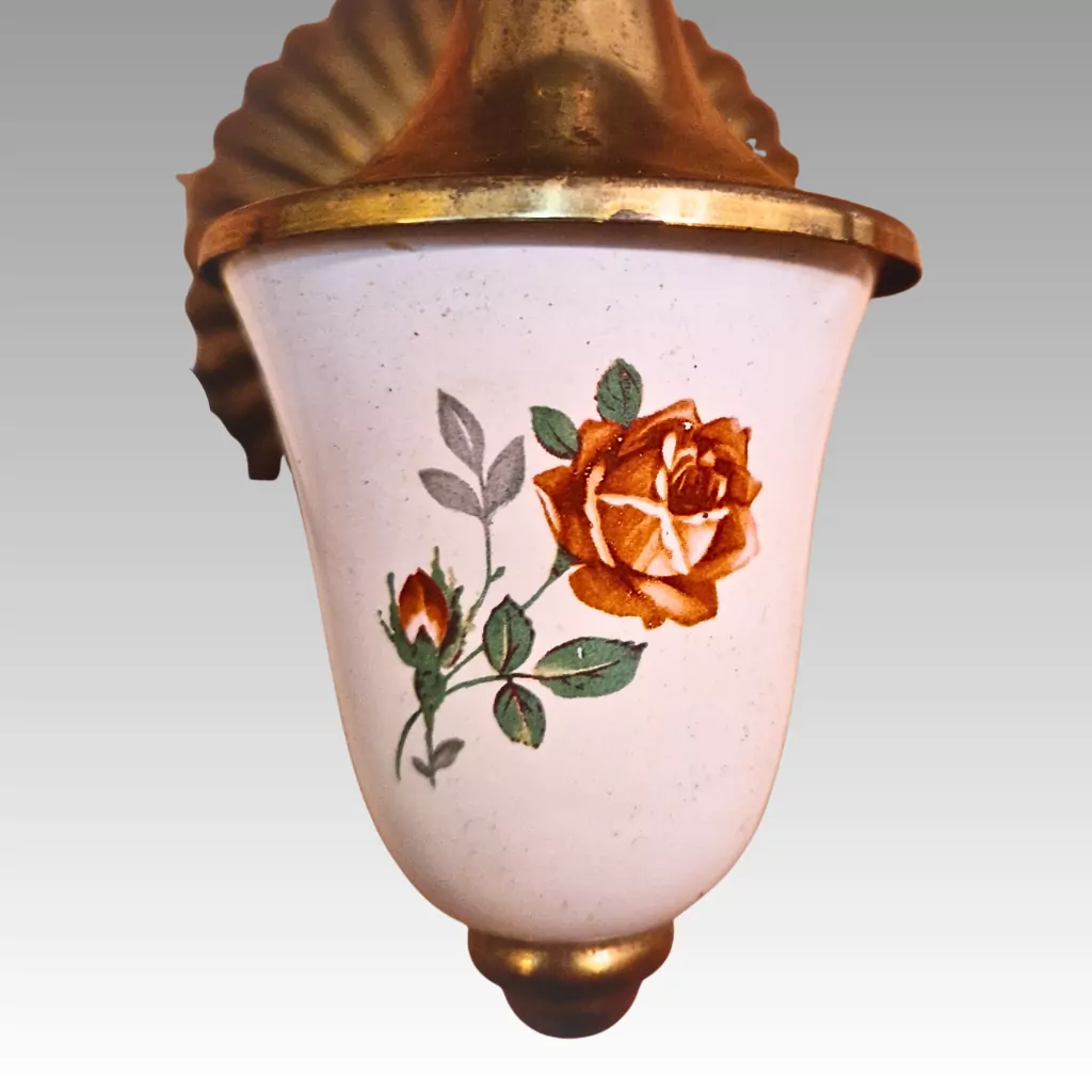 Gefertigt aus Messing und heute mit einer authentischen Patina versehen, überzeugen die Wandlampen durch ihre hochwertige Verarbeitung. Die weiße Emaille ist handbemalt mit einem feinen Rosenmotiv und sorgt für eine angenehm warme Lichtwirkung. Gehalten wird das Lampenglas von einer dekorativen, kronenförmigen Messinggalerie, die Glas und Leuchtenkörper verbindet und den historischen Charakter der 2 antiken Jugendstil Wandlampen besonders schön unterstreicht.