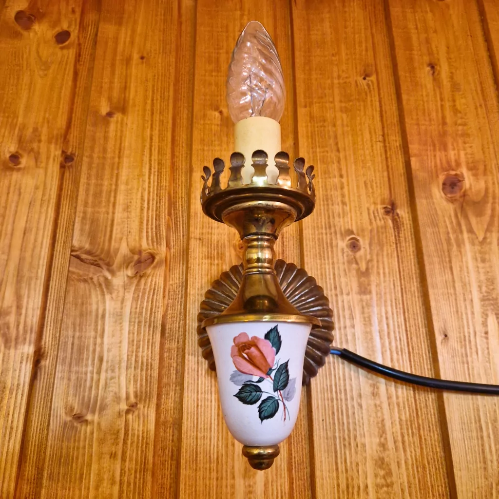 Diese 2 antiken Jugendstil Wandlampen Messing begeistern durch ihre elegante Ausstrahlung, hochwertige Materialien und liebevolle Details. Die handbemalte Emaille mit Rosenmotiv verleiht den historischen Wandlampen eine warme, wohnliche Lichtwirkung. Als originales Paar ist sie ein stilvoller Blickfang für anspruchsvolle Interieurs.