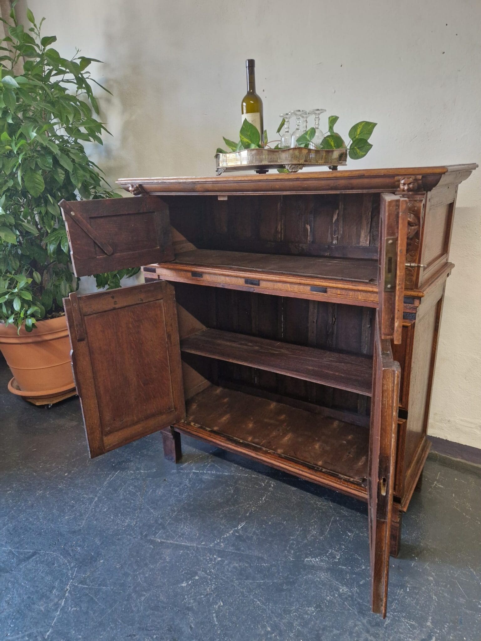 Die antike Gründerzeit Anrichte – Hochschrank verfügt über vier abschließbare Türen – ein Schlüssel ist vorhanden. Im Inneren bieten drei geräumige Fächer reichlich Platz für Geschirr, Bücher oder persönliche Schätze.
