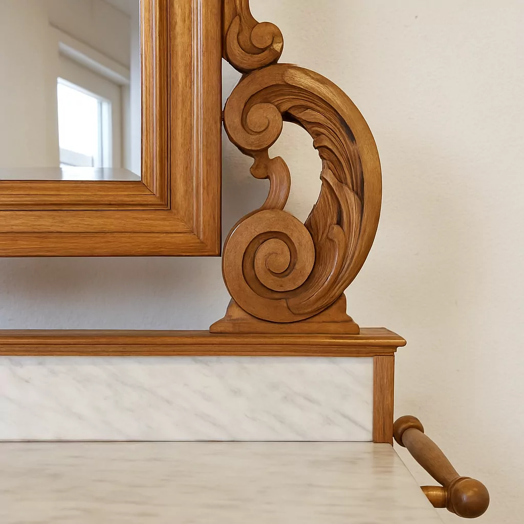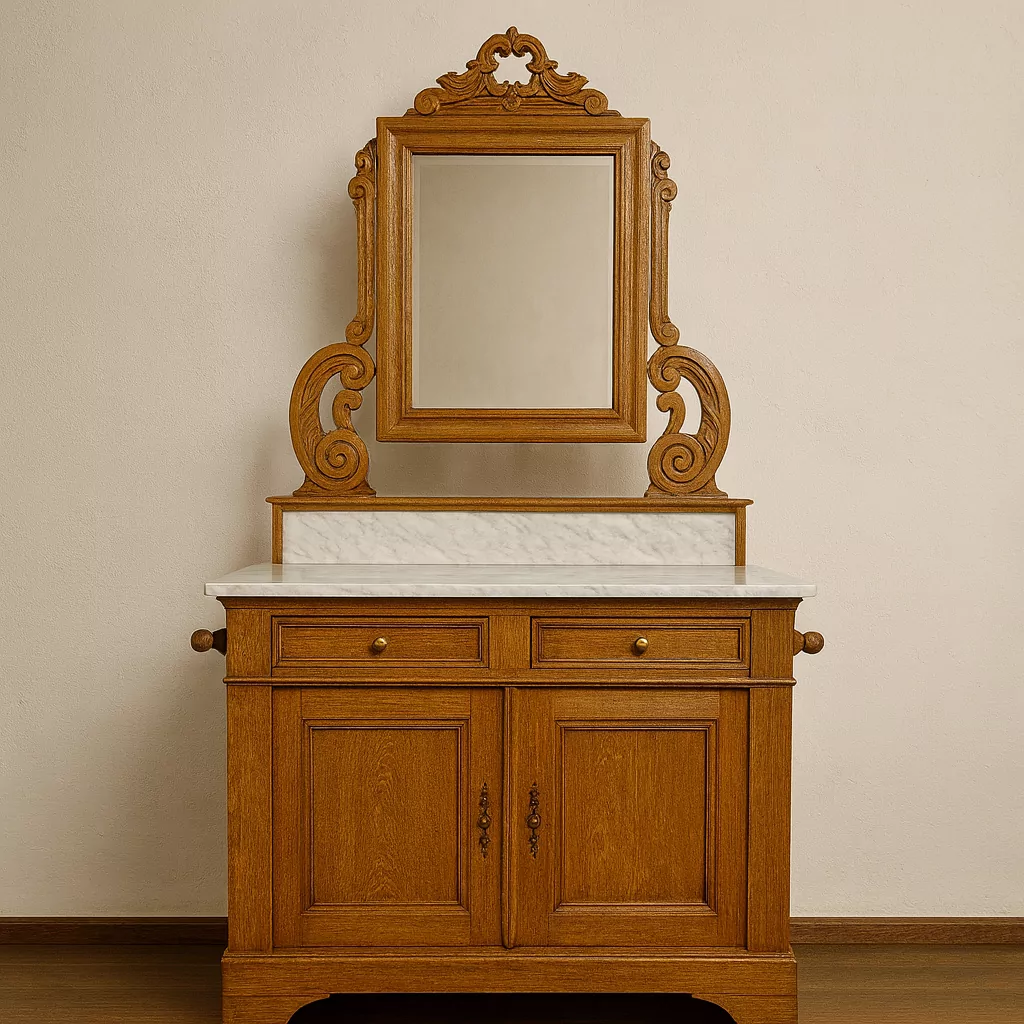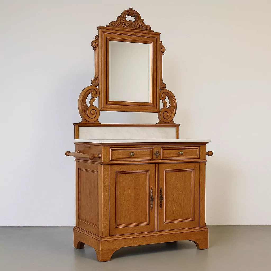 Antike französische Anrichte mit Spiegelaufsatz – Waschkommode aus Eiche mit Marmorplatte und beweglichem Spiegel, um 1900. Restauriert, massiv, dekorativ und ideal für Vintage- oder Landhaus-Einrichtungen. Hochwertiges Originalstück mit viel Charme.