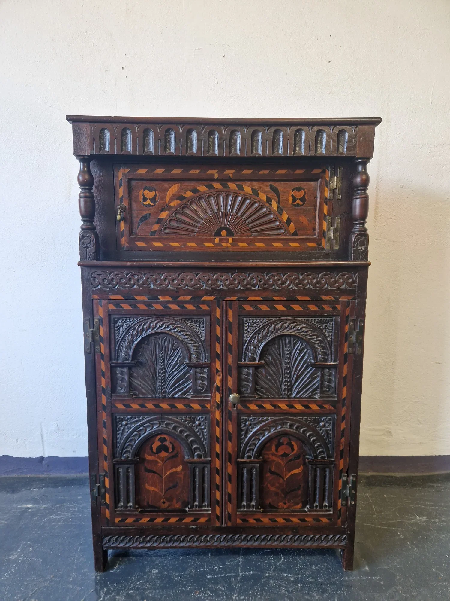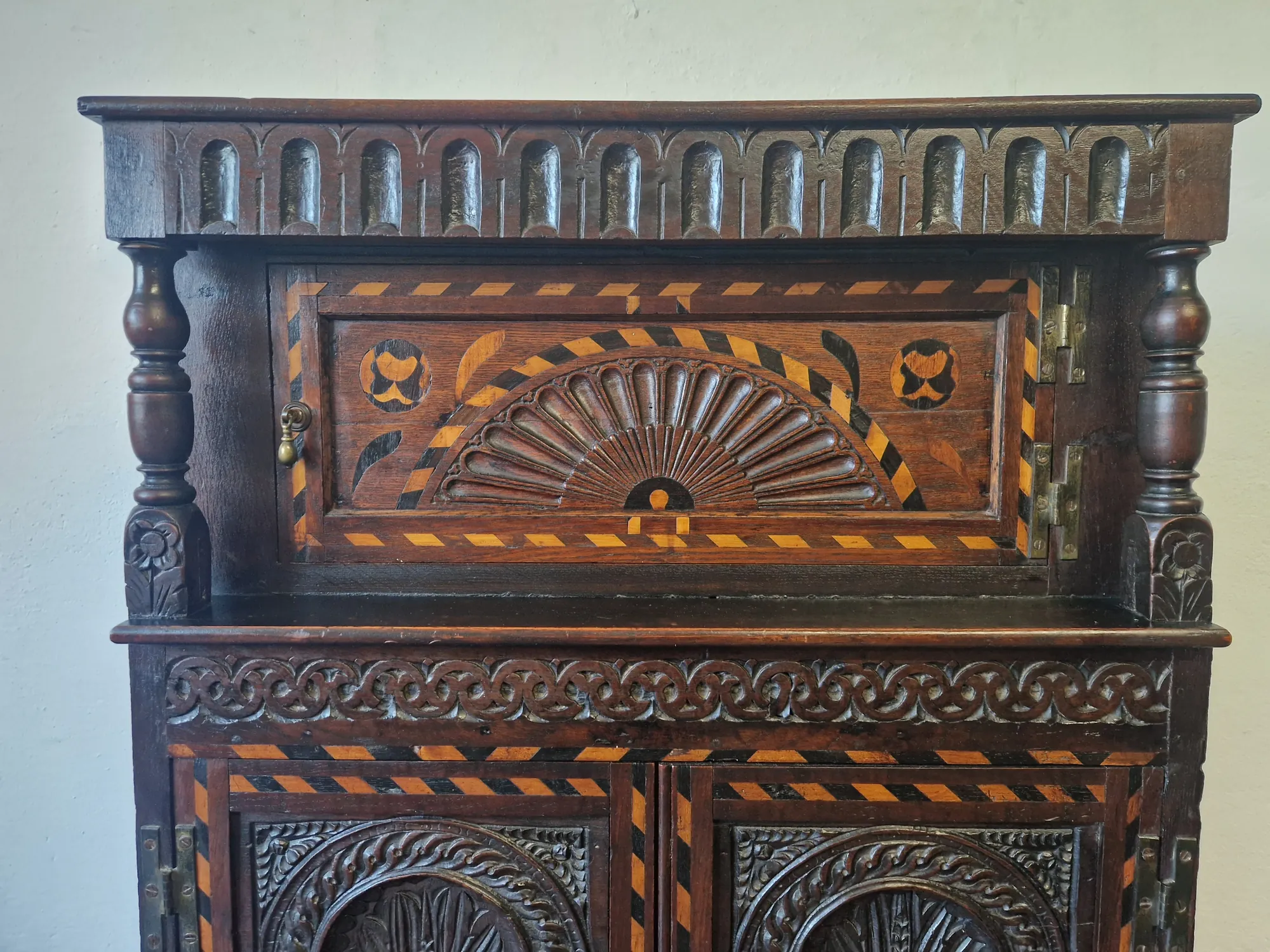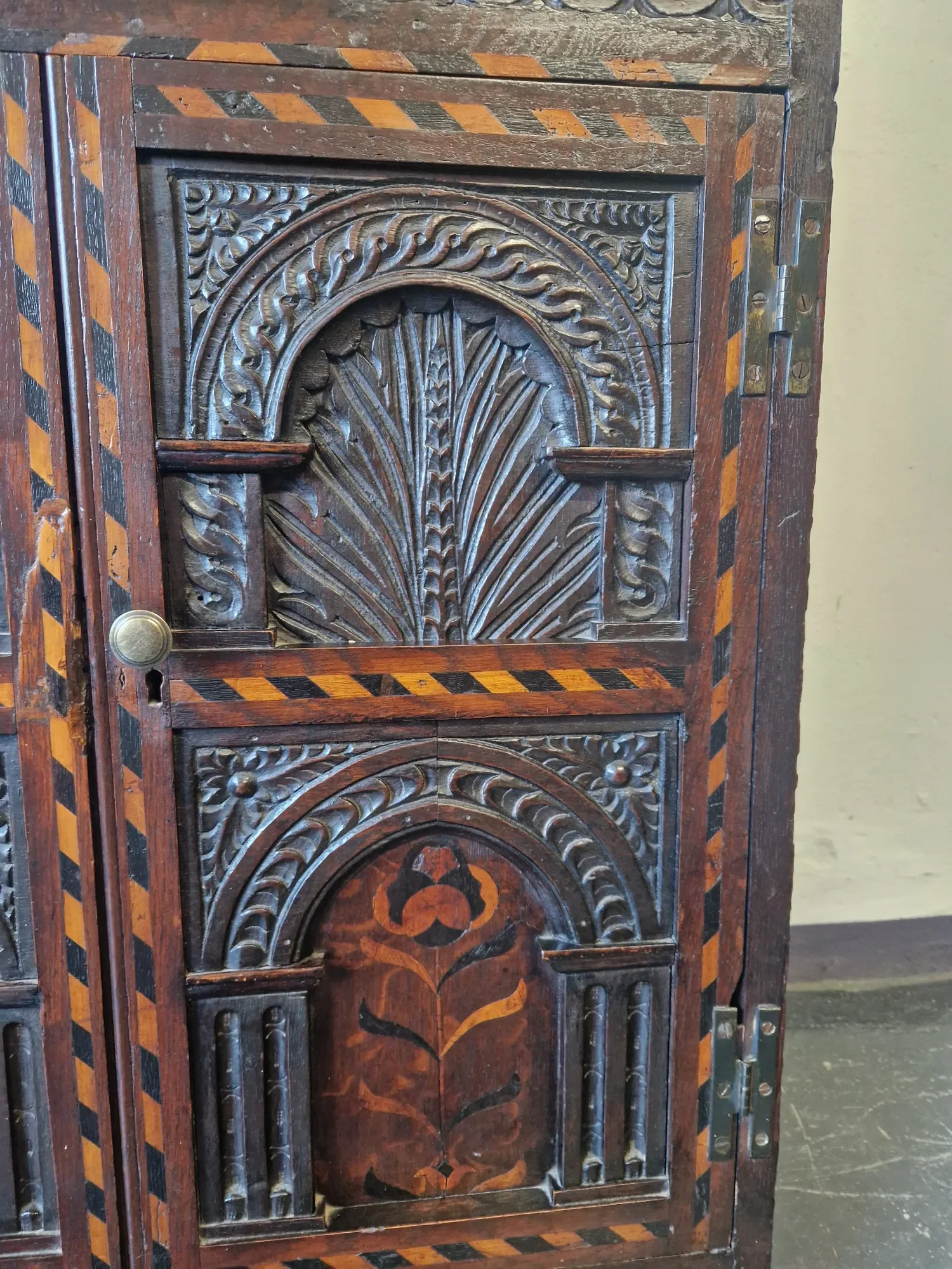 Antike Anrichte aus massivem Eichenholz mit kunstvollen Intarsien und feinen Schnitzereien, um 1850 gefertigt. Der Schrank verfügt über drei Türen, eine sichere Drehverriegelung oben und Magnetverschlüsse unten. Innen mit grünem Filz ausgekleidet, bietet der Vertico viel Stauraum und zeitlosen Charme.