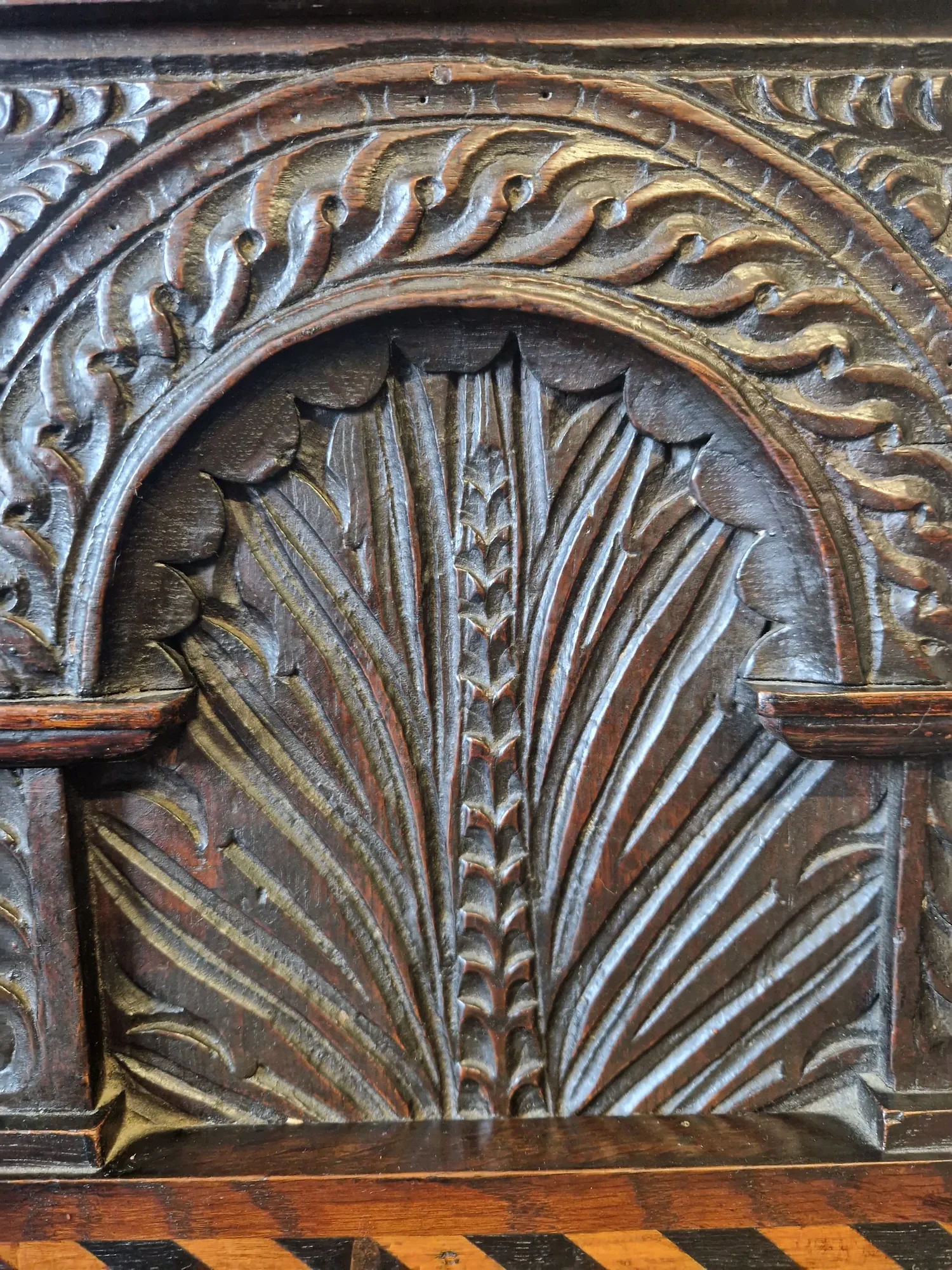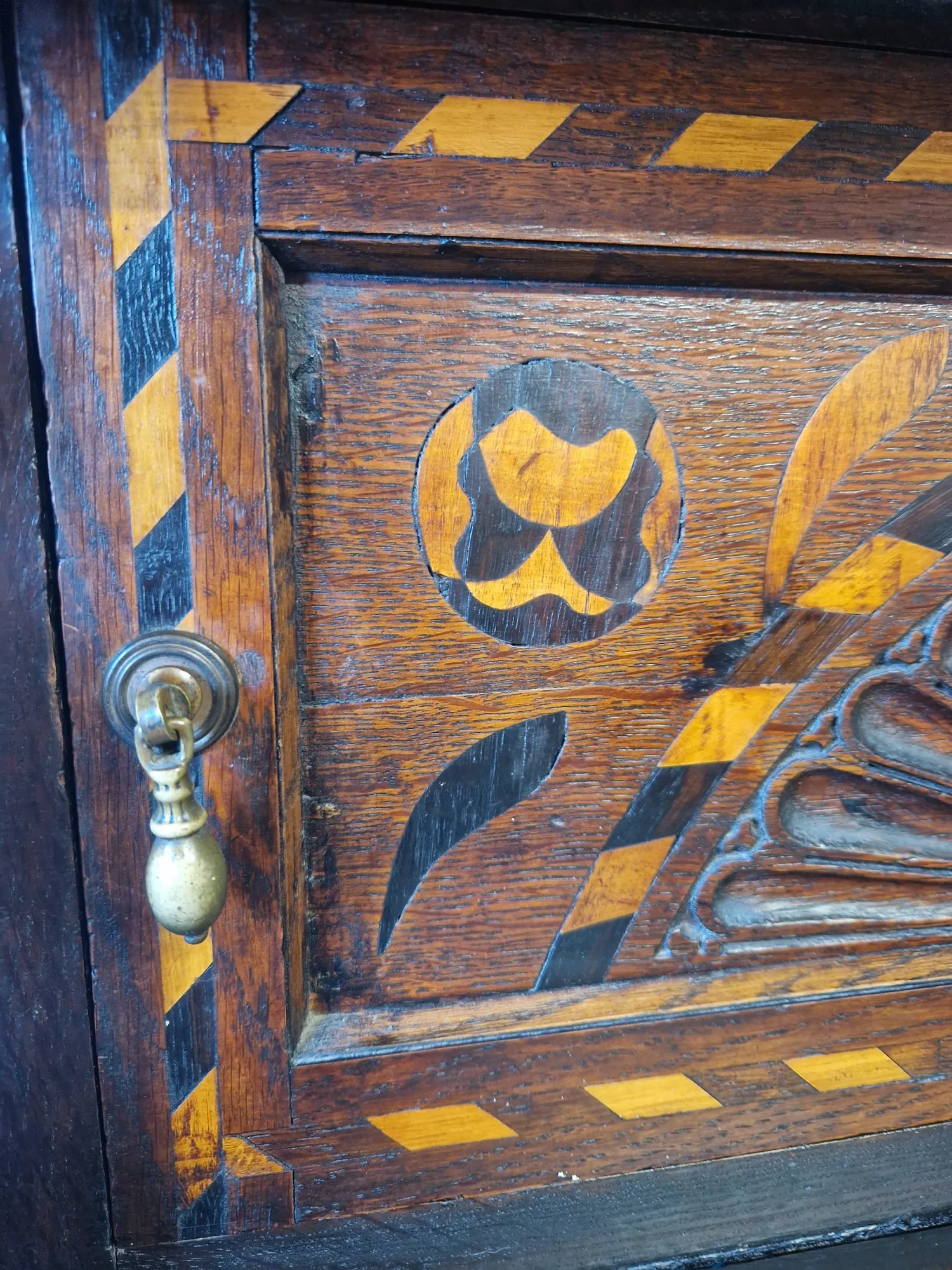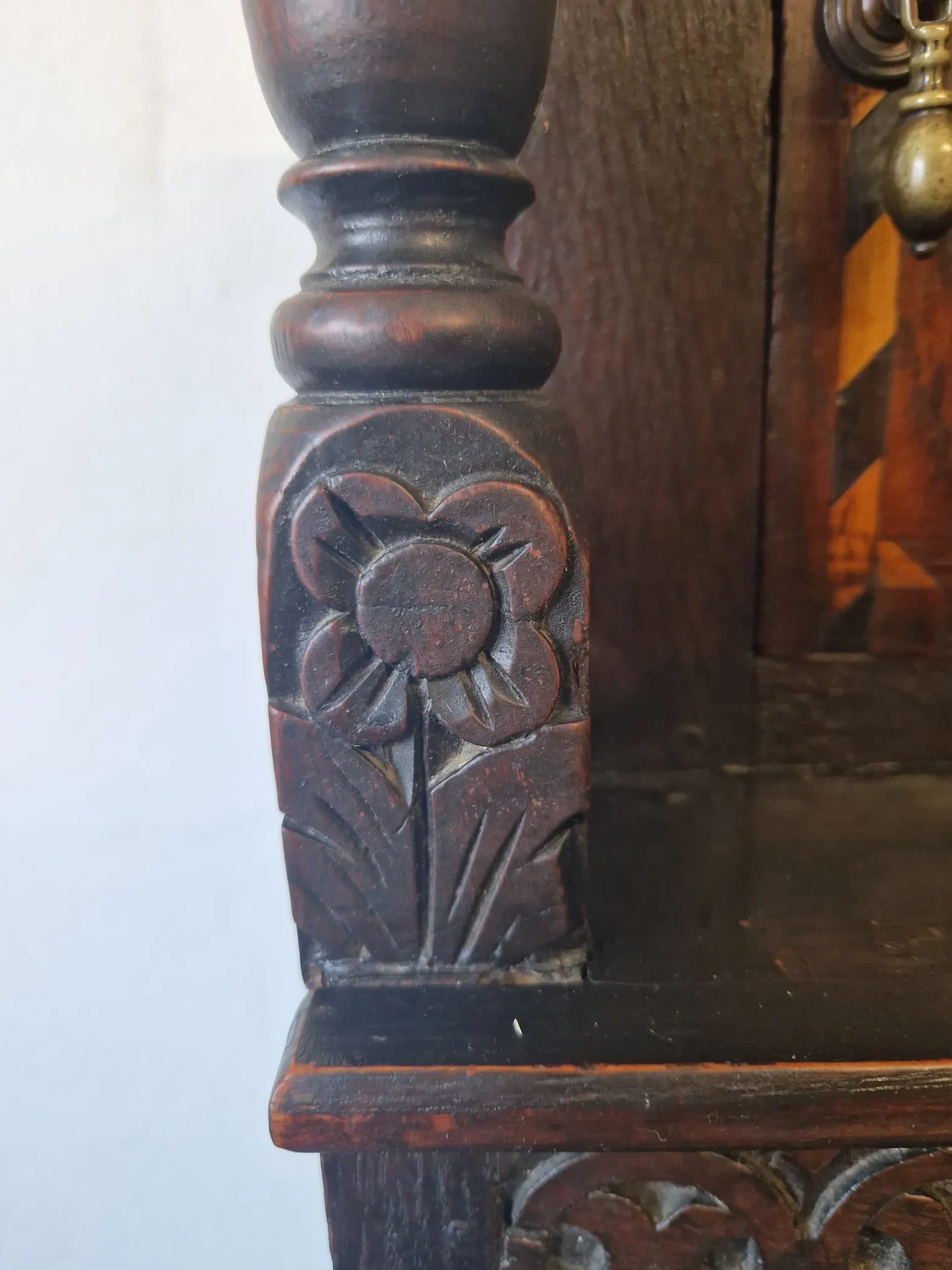 Diese antike Anrichte – Schrank – Vertiko aus der Zeit um 1850 wurde aus massivem Eichenholz gefertigt und mit viel Liebe zum Detail gestaltet. Besonders auffällig sind die kunstvollen Intarsien und feinen Schnitzereien, die den Schrank zu einem echten Blickfang machen.