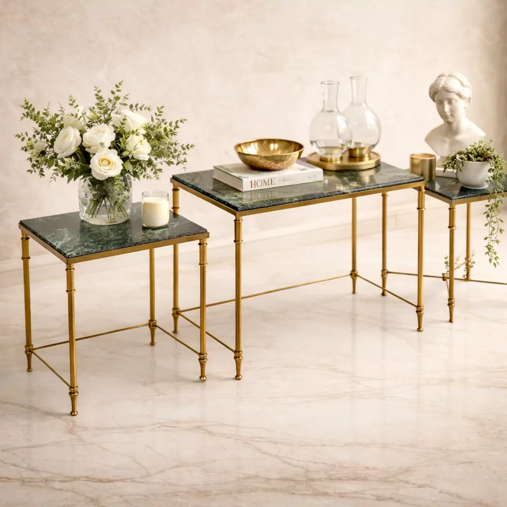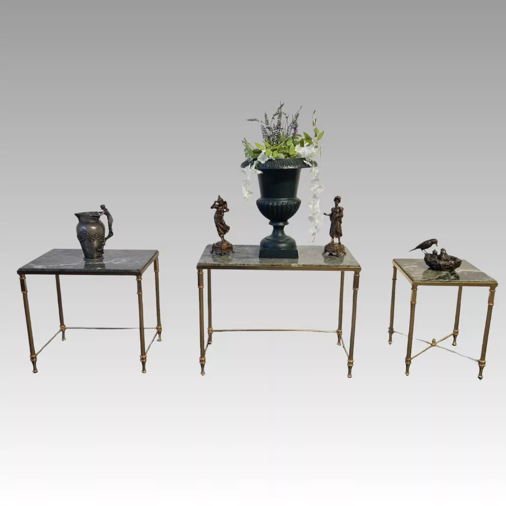 Startseite » Onlineshop » Antike Beistelltische 3er Set Satztische Messing Marmor
