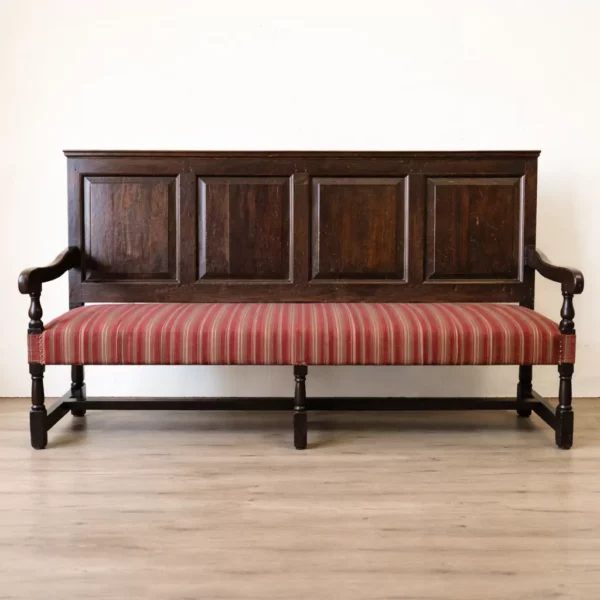 Der georgianische Settle Bench-Stil zeichnet sich durch klare Proportionen, funktionale Eleganz und eine robuste, architektonische Bauweise aus, bei der Komfort und Dauerhaftigkeit im Vordergrund stehen. Typisch sind hohe, getäfelte Rückenlehnen aus massiver Eiche, die ursprünglich sowohl als Sitzmöbel als auch als Wind- und Wärmeschutz in englischen Wohnhäusern dienten.