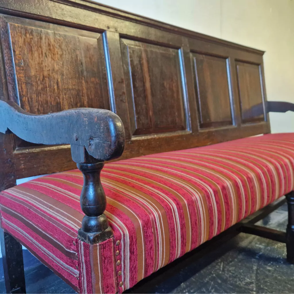 Die Sitzfläche wurde neu gepolstert und bezogen, wobei ein hochwertiger, historisch anmutender englischer Stoff gewählt wurde. Der Bezug fügt sich farblich und gestalterisch sehr gut in das Gesamtbild ein, ohne den authentischen Eindruck des Möbels zu beeinträchtigen. Minimale altersbedingte Gebrauchsspuren am Holz sind vorhanden und ausdrücklich erwünscht, da sie die Geschichte und Echtheit der Sitzbank unterstreichen.