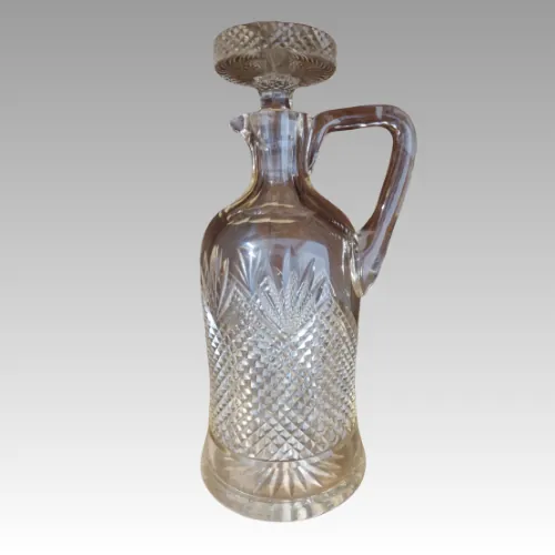 Antike Kristallkaraffe mit Henkel, geschliffenem Stöpsel und detailreichem Schliffdekor. Ideal für Wein, Likör oder als dekoratives Sammlerstück. Klassische Eleganz für Tisch und Vitrine.