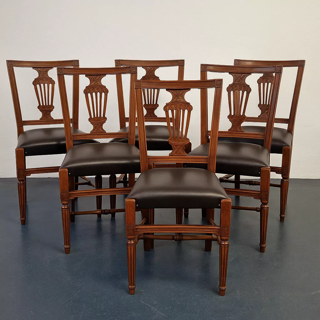 Antikes klassizistisches Esszimmerstuhl-Set (6 Stück) aus massiver Buche mit charakteristischer Lyra-Rückenlehne und floralen Schnitzereien, datiert um 1880. Die Stühle wurden neu gepolstert und mit hochwertigem, pflegeleichtem Leder bezogen und sind stabil sowie voll einsatzfähig. Ideal als stilvoller Blickfang für Esszimmer, Altbau oder klassisches Interieur.