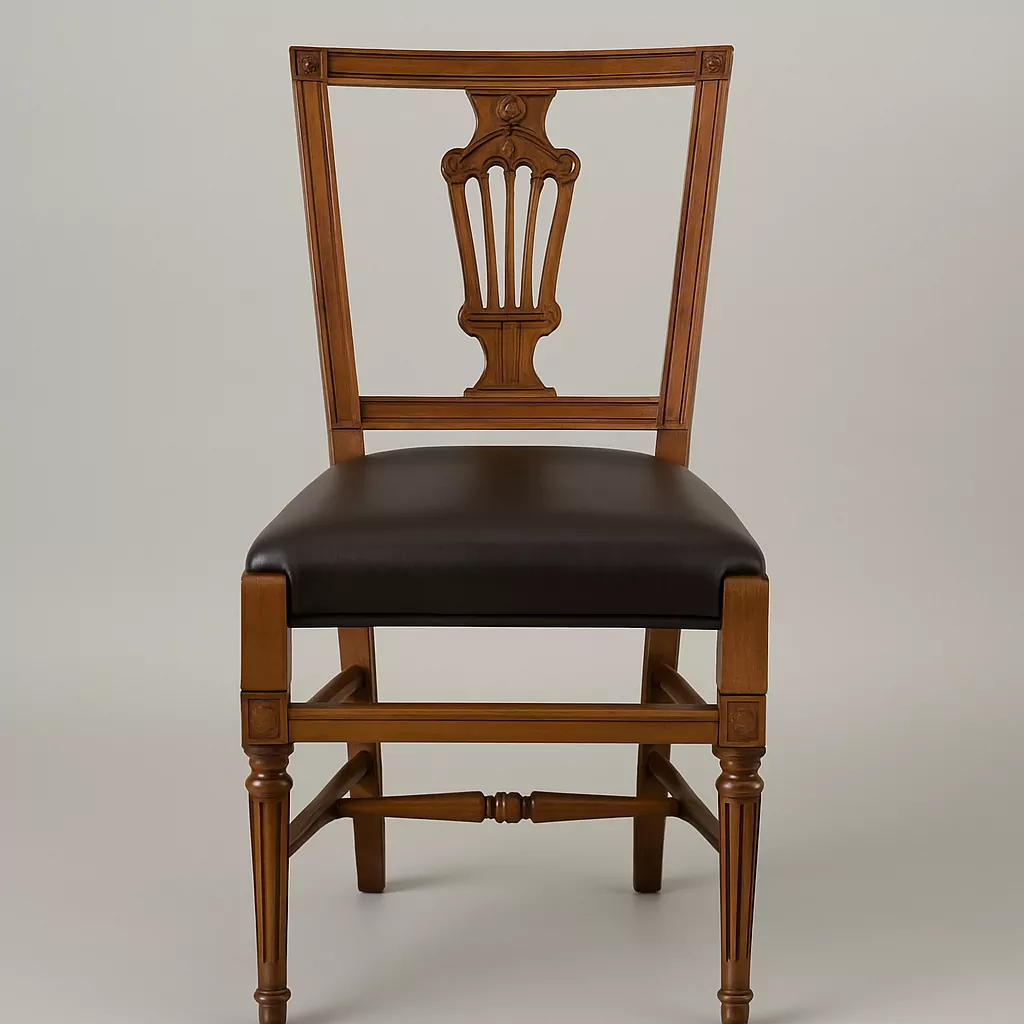 Dieses klassizistische Esszimmerstuhl Set mit Lyra-Rückenlehne verbindet Geschichte, Handwerkskunst und Alltagstauglichkeit und ist damit eine wertige und langlebige Wahl für Liebhaber klassischer Möbel.