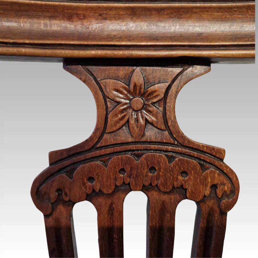 Die Lyra-Stühle zeichnen sich durch ihre stabile Bauweise aus. Die 6 antiken Stühle sind nicht zerlegbar, was für ihre Langlebigkeit spricht. Die gedrechselten Beine, die Streben sowie die gerahmte Rückenlehne sorgen für eine hohe Stabilität. Die floralen Schnitzereien an Rückenlehne und Zargen wurden handwerklich ausgeführt und verleihen dem Set eine dezente, aber hochwertige Verzierung.