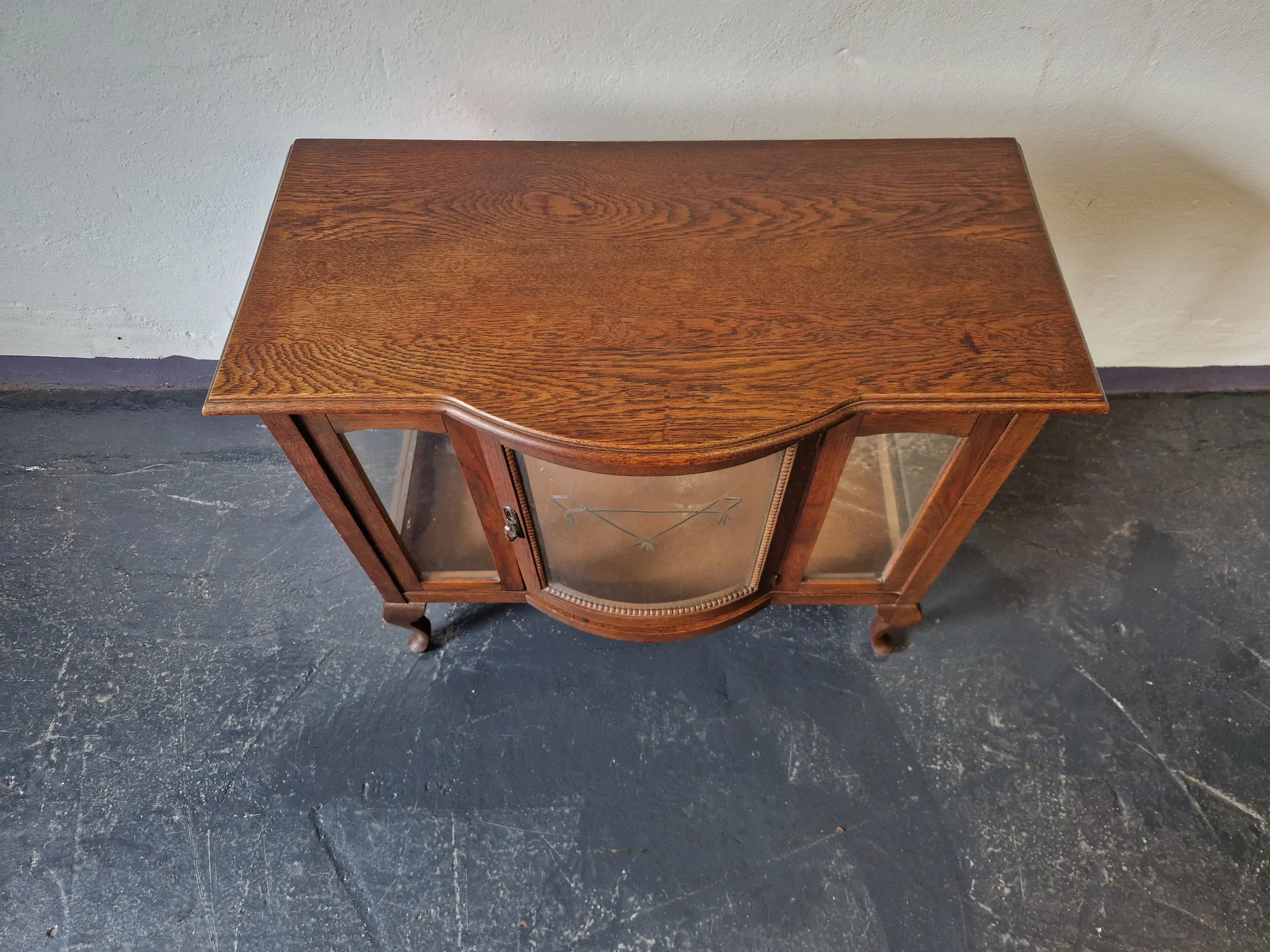 Diese antike Jugendstil Vitrine – Barschrank – Teeschrank stammt aus der Zeit um 1910. Sie wurde aus edlem Eichenholz gefertigt und zeigt feine Jugendstil-Elemente. Die Glastüren und eleganten Verzierungen machen sie zu einem besonderen Möbelstück. Sie steht auf schönen geschwungenen Beinen.