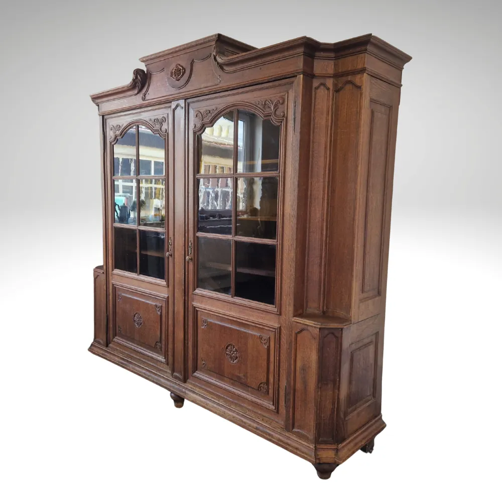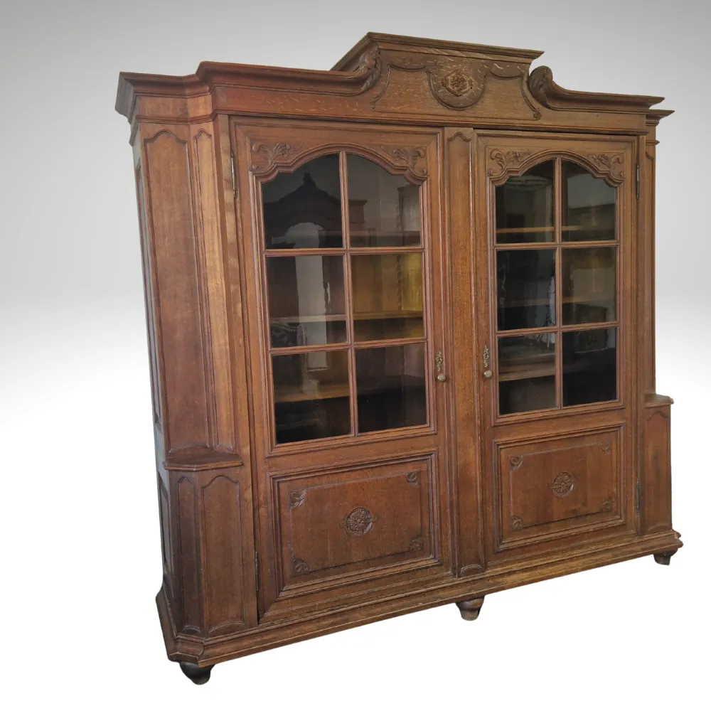 Der antike Jugendstil Bücherschrank-Vitrine bietet großzügigen Stauraum mit insgesamt acht höhenverstellbaren Einlegeböden aus Weichholz. Ob als klassischer Bücherschrank oder als Vitrine für dekorative Sammlerstücke – durch die praktische Aufteilung mit zwei Türen und viel Platz eignet sich dieses Möbelstück für vielseitige Einsatzmöglichkeiten.