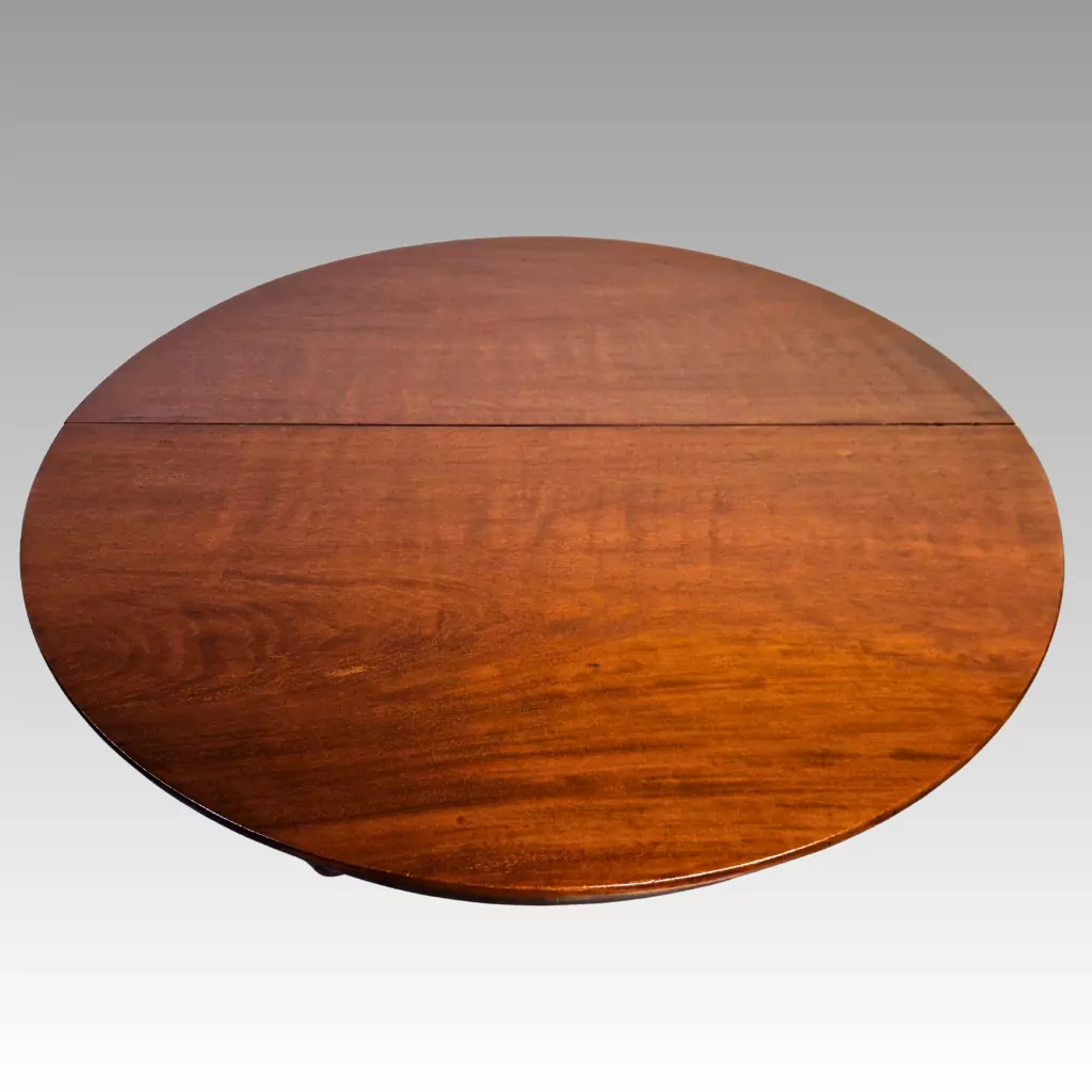 Im runden Zustand bietet der Tisch Platz für bis zu sechs Personen. Ausgezogen erreicht er eine Länge von etwa 240 cm und ermöglicht bequemes Sitzen für bis zu zwölf Personen. Diese Flexibilität macht den antiken Esstisch aus Mahagoni zu einem vielseitigen Möbelstück, das auch heutigen Wohnansprüchen gerecht wird.