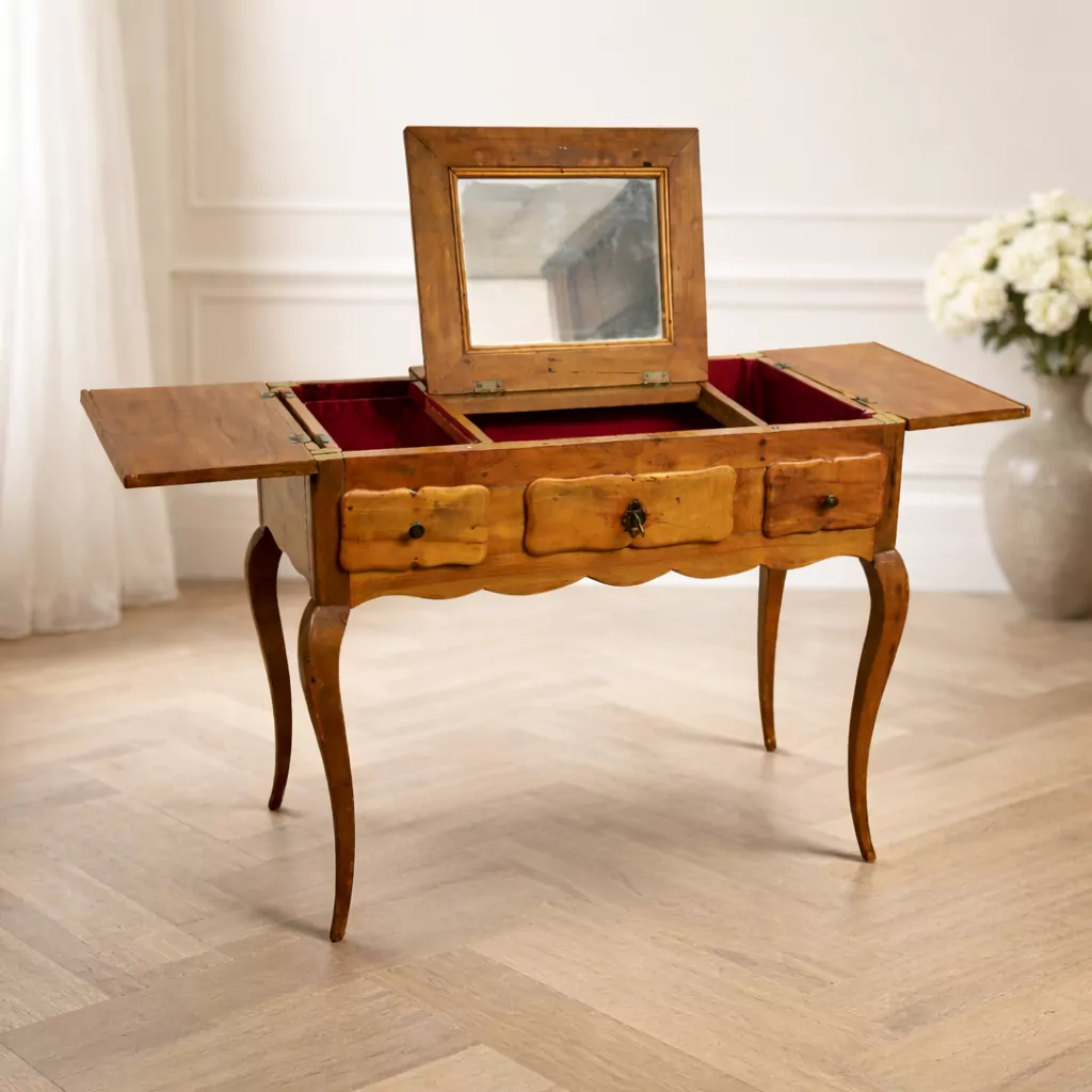 Dieser antike französische Schminktisch ist ein außergewöhnliches Beispiel französischer Möbelkunst um 1800. Als sogenannte Poudreuse vereint er Funktionalität und repräsentative Gestaltung auf harmonische Weise. Möbel dieser Art gehörten ursprünglich zur gehobenen Wohnkultur und waren speziell für die privaten Rituale des Tages gedacht. Die fein geschwungenen Linien, die ausgewogenen Proportionen und die elegante Silhouette spiegeln den Einfluss des Louis-XV-Stils wider, der für Leichtigkeit, Anmut und fließende Formen steht.