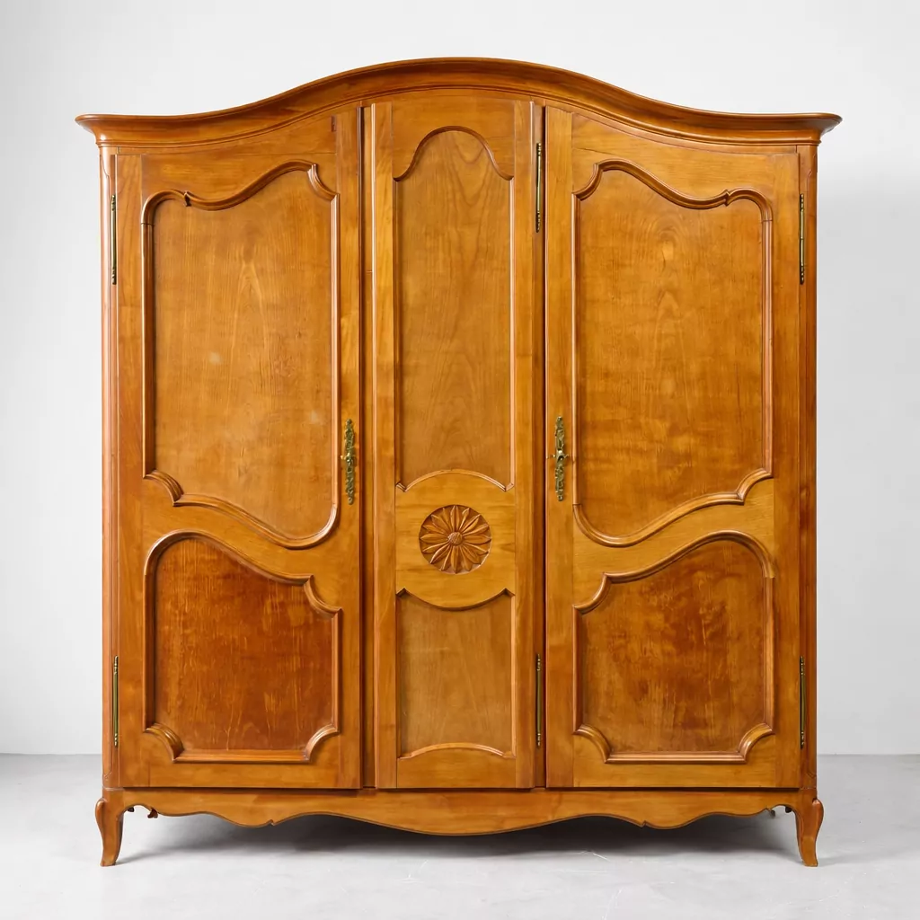 Eleganter, dreitüriger Kleiderschrank aus massivem Holz (überwiegend Kirschholz) im französisch-klassischen Stil aus der ersten Hälfte des 20. Jahrhunderts. Der Schrank überzeugt durch hochwertige Verarbeitung, Messingbeschläge, funktionierende Schlösser sowie eine praktische Innenaufteilung mit Kleiderstange, Einlegeböden und Schublade. Ideal als stilvoller Kleiderschrank, Dielen- oder Wäscheschrank mit zeitloser Ausstrahlung.