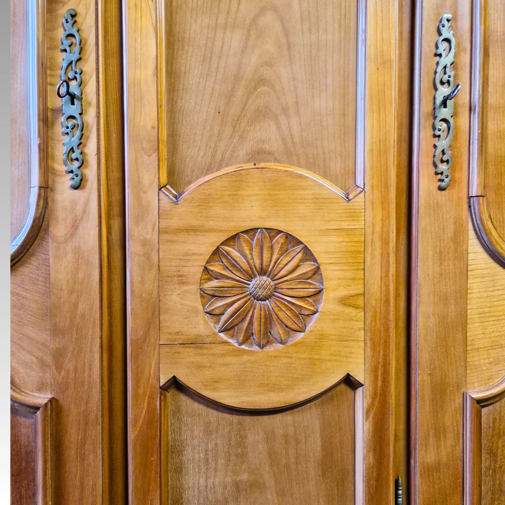 Die Verarbeitung deutet auf eine qualitätsvolle Werkstatt- oder Manufakturarbeit hin. Sauber gearbeitete Profile, gleichmäßige Holzstärken und stabile Verbindungen sprechen klar gegen industrielle Massenfertigung. Minimale altersbedingte Gebrauchsspuren sind vorhanden und unterstreichen den authentischen Charakter, ohne die Funktion zu beeinträchtigen. Lediglich die rechte Tür ist minimal verzogen, lässt sich jedoch problemlos schließen und mindert weder die Stabilität noch die Alltagstauglichkeit dieses massiven Kleiderschranks aus Kirschholz.