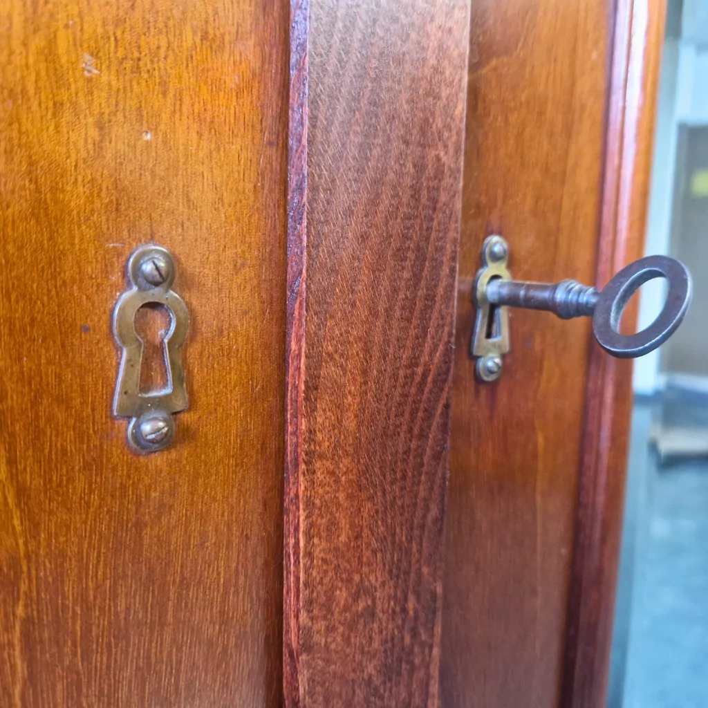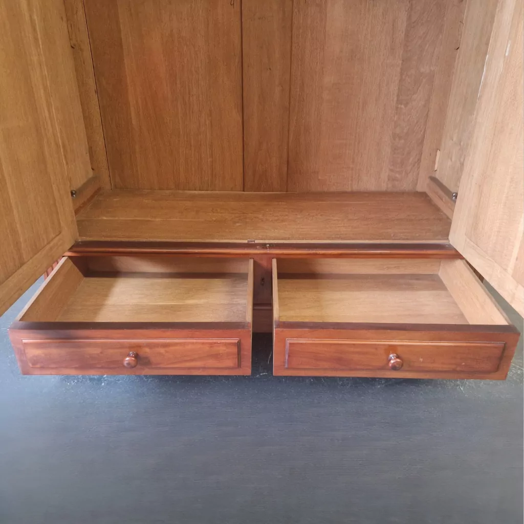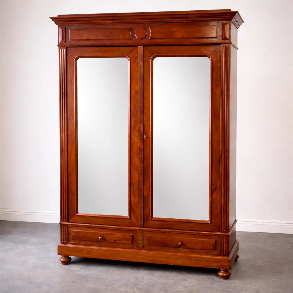 Feine Messingbeschläge ergänzen das Gesamtbild und harmonieren mit dem warmen Mahagoniton. Die handwerkliche Verarbeitung zeigt sich in stabilen Verbindungen, sauber gearbeiteten Kanten und einer insgesamt sehr soliden Konstruktion. Der Schrank steht auf einem kräftigen Sockel mit integrierten Schubladen, die zusätzlichen Stauraum für Wäsche oder Accessoires bieten. Diese Kombination aus Funktionalität und ästhetischer Wirkung macht ihn zu einem vielseitig nutzbaren Möbelstück für Schlafzimmer, Ankleidezimmer oder stilvolle Wohnbereiche.