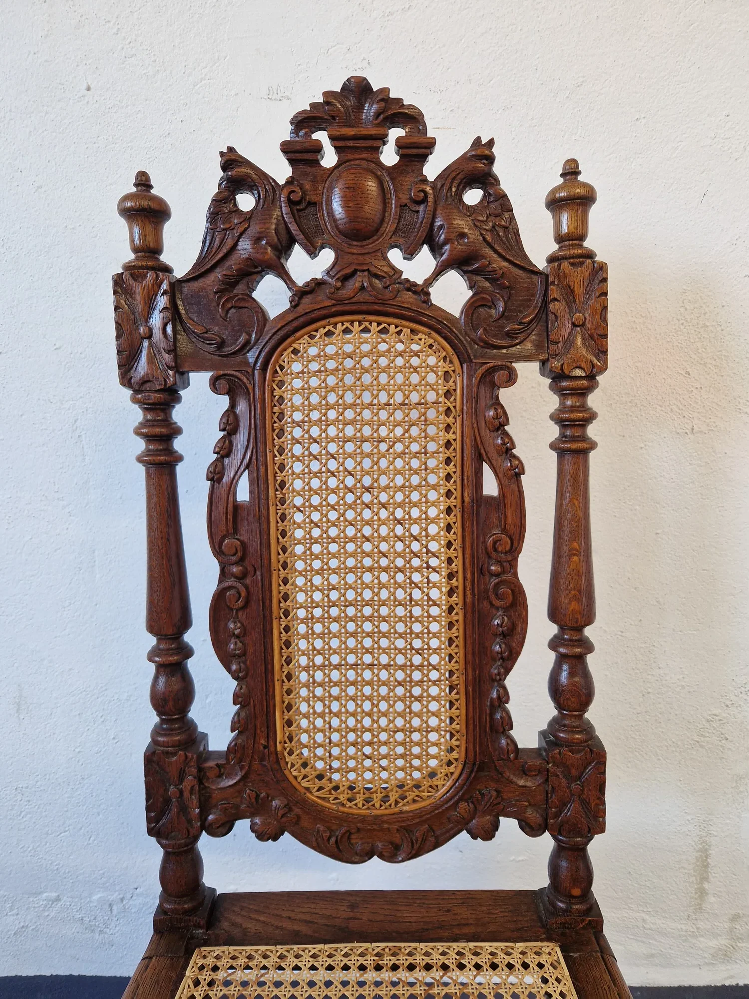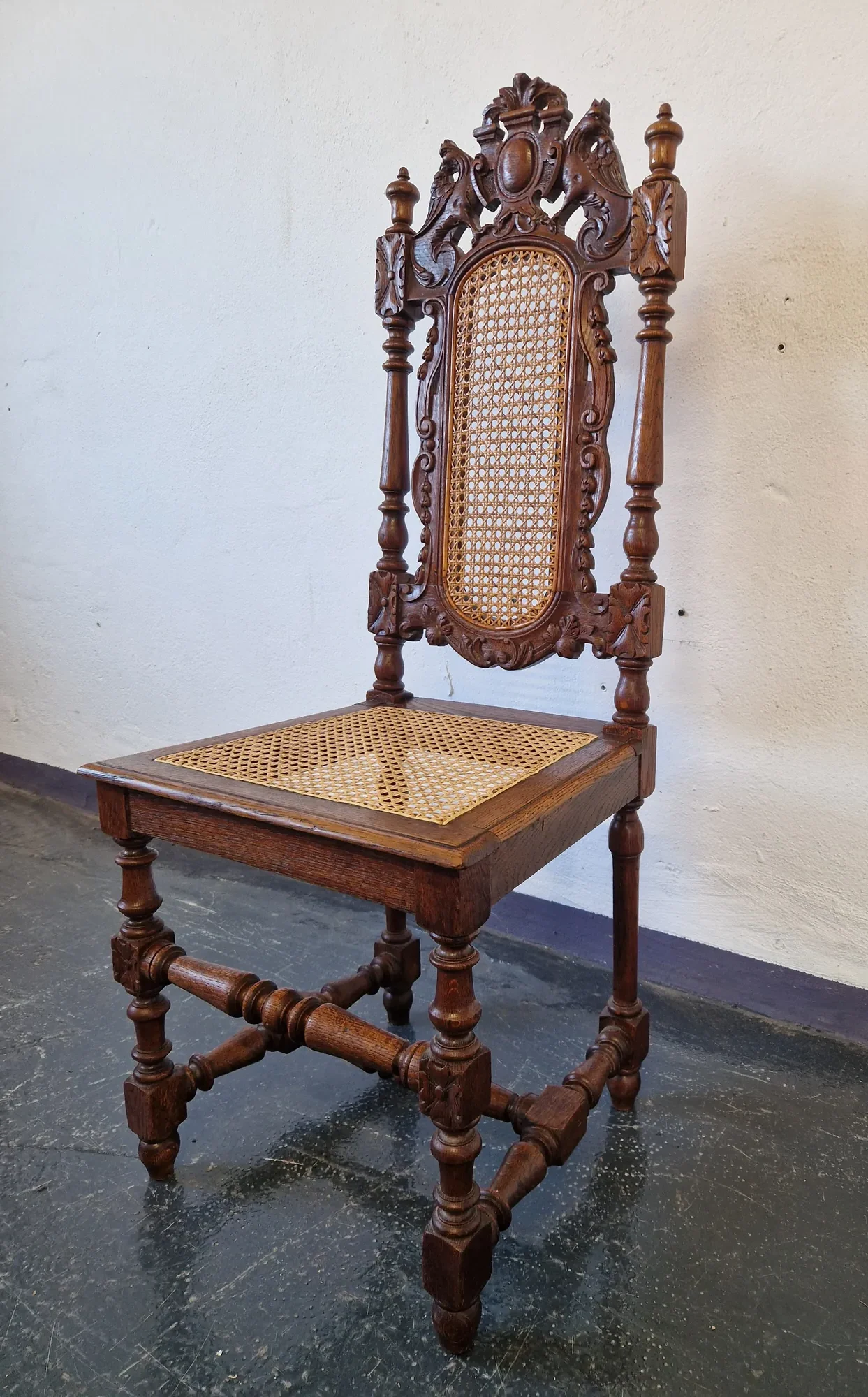 Dieser antike Stuhl – Prunkstuhl – Bürostuhl wurde um 1850 gefertigt und besticht durch seine kunstvolle Verarbeitung. Gefertigt aus massiver Eiche und mit einem stabilen Korbgeflecht versehen, vereint er Robustheit mit einer edlen Ausstrahlung. Die handgeschnitzten Details unterstreichen die hohe Qualität und den historischen Wert dieses außergewöhnlichen Möbelstücks.