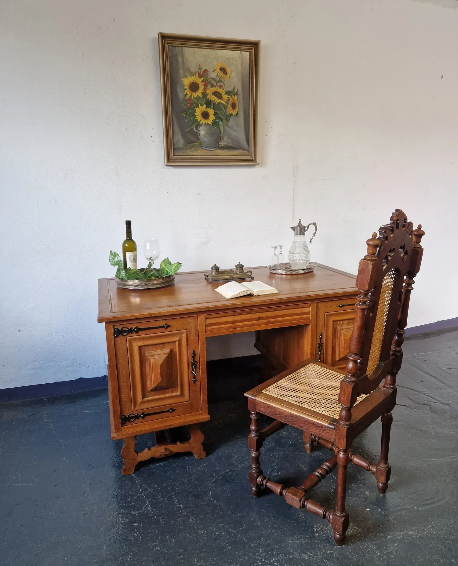 Der antike Stuhl – Prunkstuhl – Bürostuhl befindet sich in einem hervorragenden originalen Zustand. Die feinen Schnitzereien in der Rückenlehne und das sehr gut erhaltene Korbgeflecht machen ihn zu einem echten Blickfang. Dank seiner authentischen Ausstrahlung eignet er sich hervorragend als dekoratives Einzelstück oder als exklusiver Sitzplatz im Büro oder Wohnbereich.
