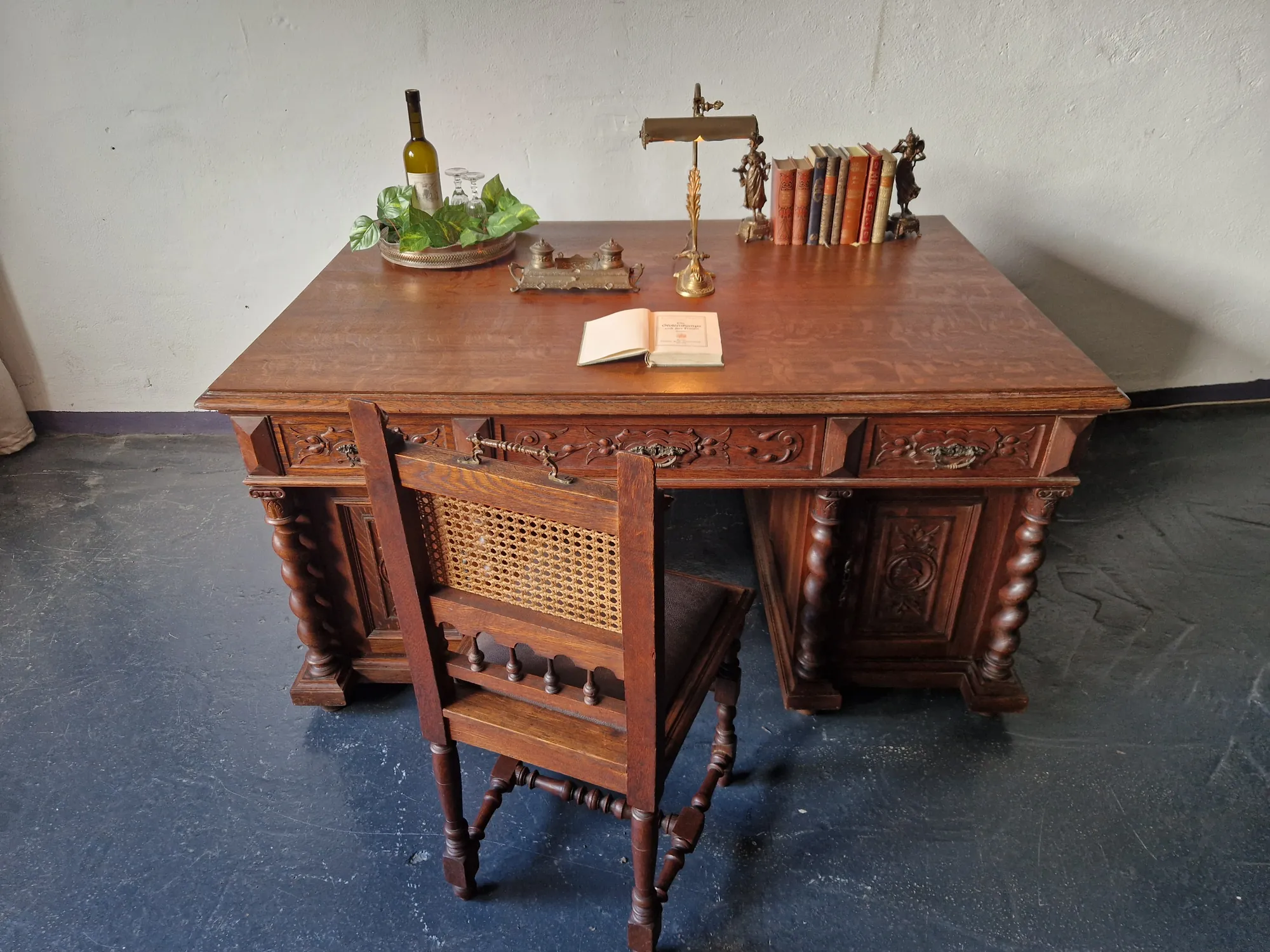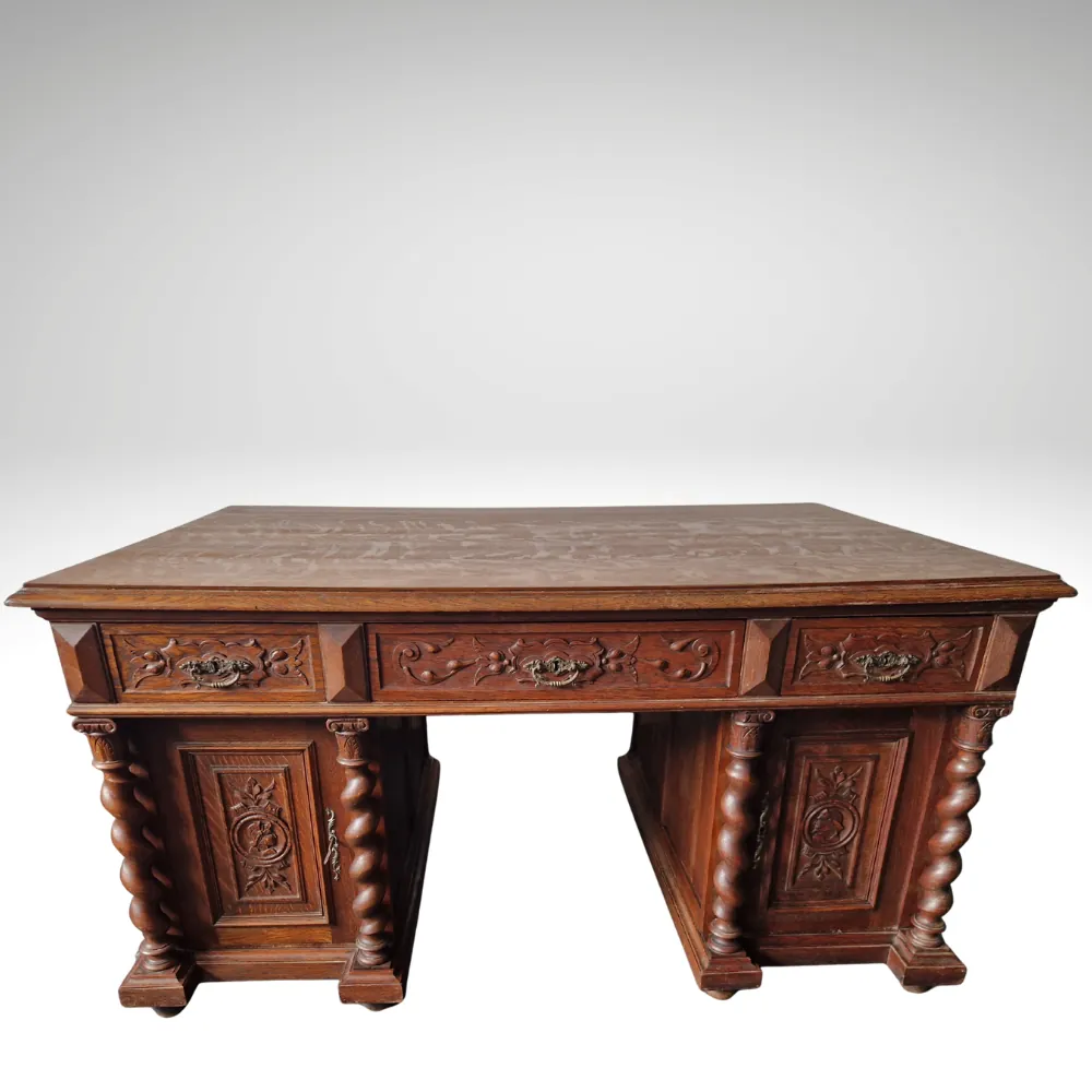 Startseite » Onlineshop » antiker Schreibtisch Doppelschreibtisch Ritter traumhafte Schnitzereien 1860