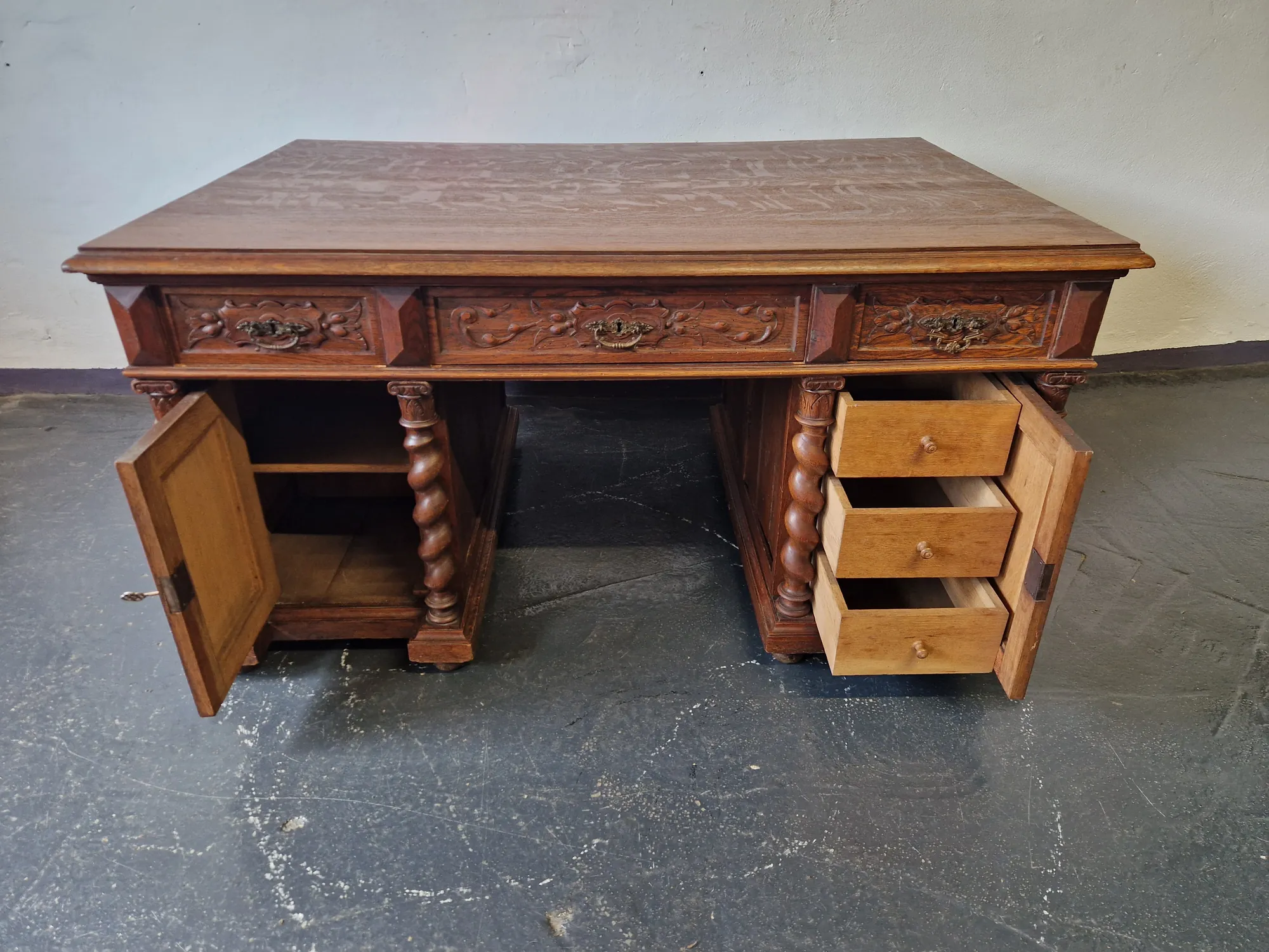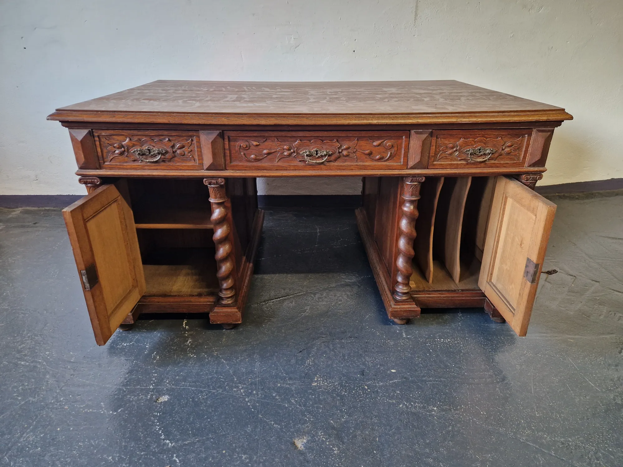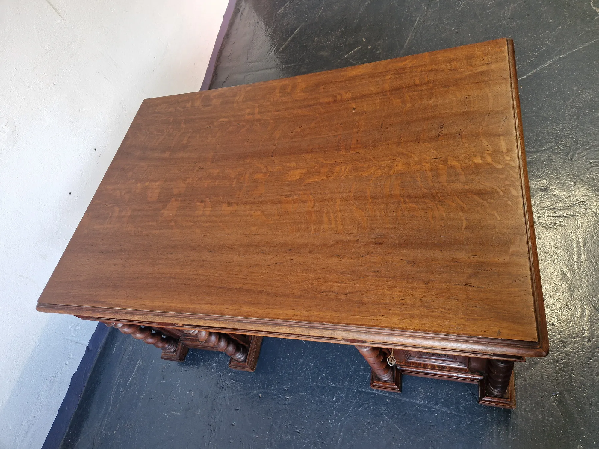 Das seltene Möbel ist freistehend, beidseitig nutzbar und verfügt über vier abschließbare Türen sowie sechs Schubladen – drei je Seite. Zwei passende Schlüssel sind erhalten. Der antiker Schreibtisch Doppelschreibtisch mit Ritter Schnitzereien wurde fachmännisch behandelt; minimale Spuren früheren Holzwurmbefalls sind inaktiv und Teil seiner Geschichte.