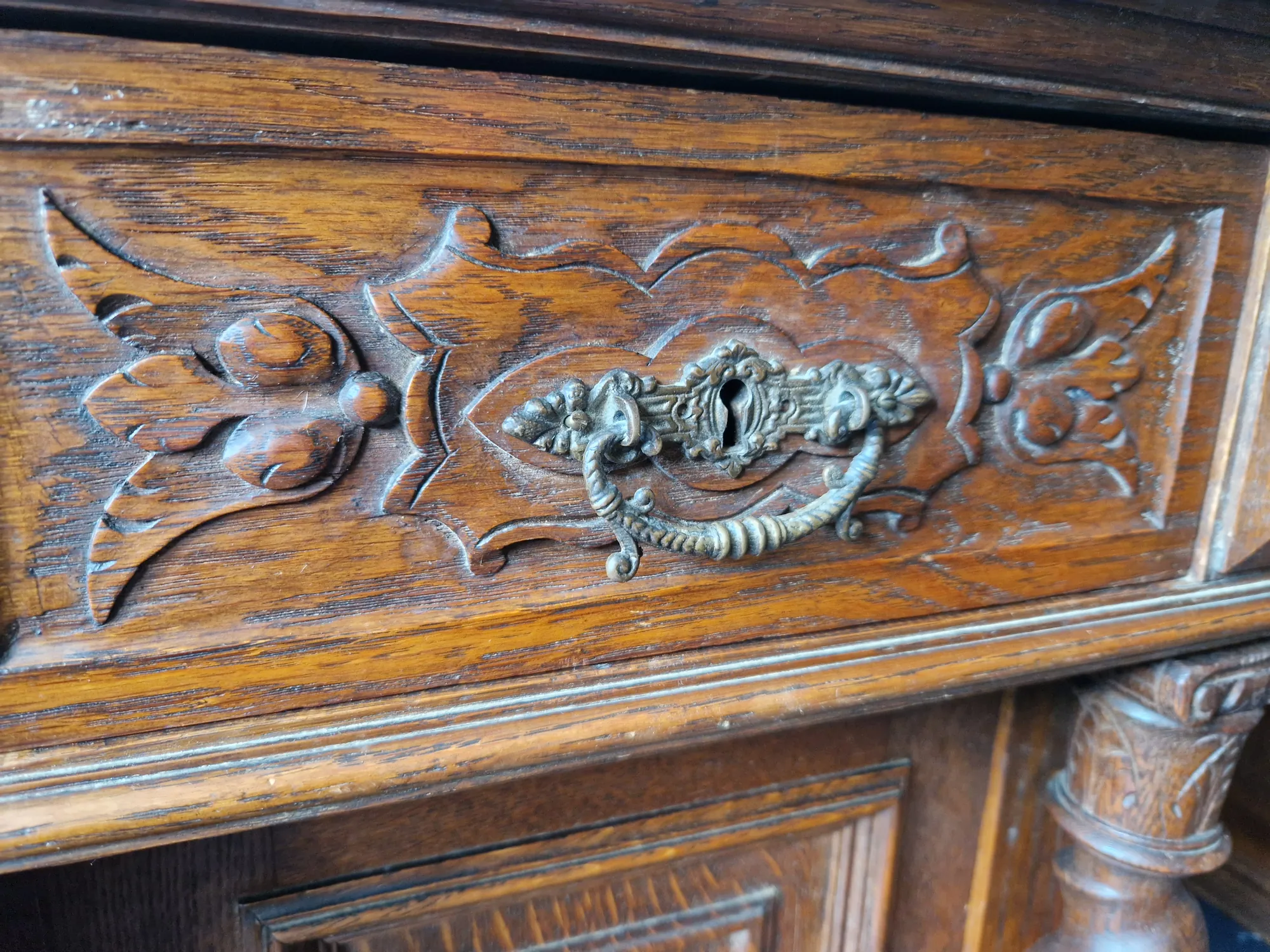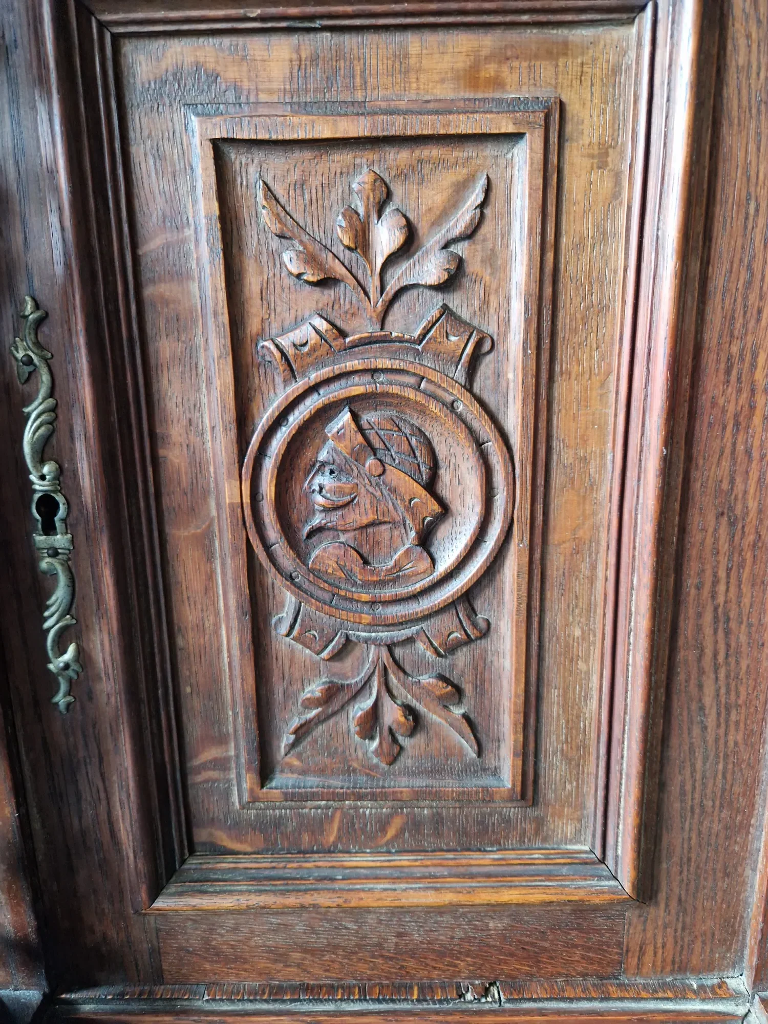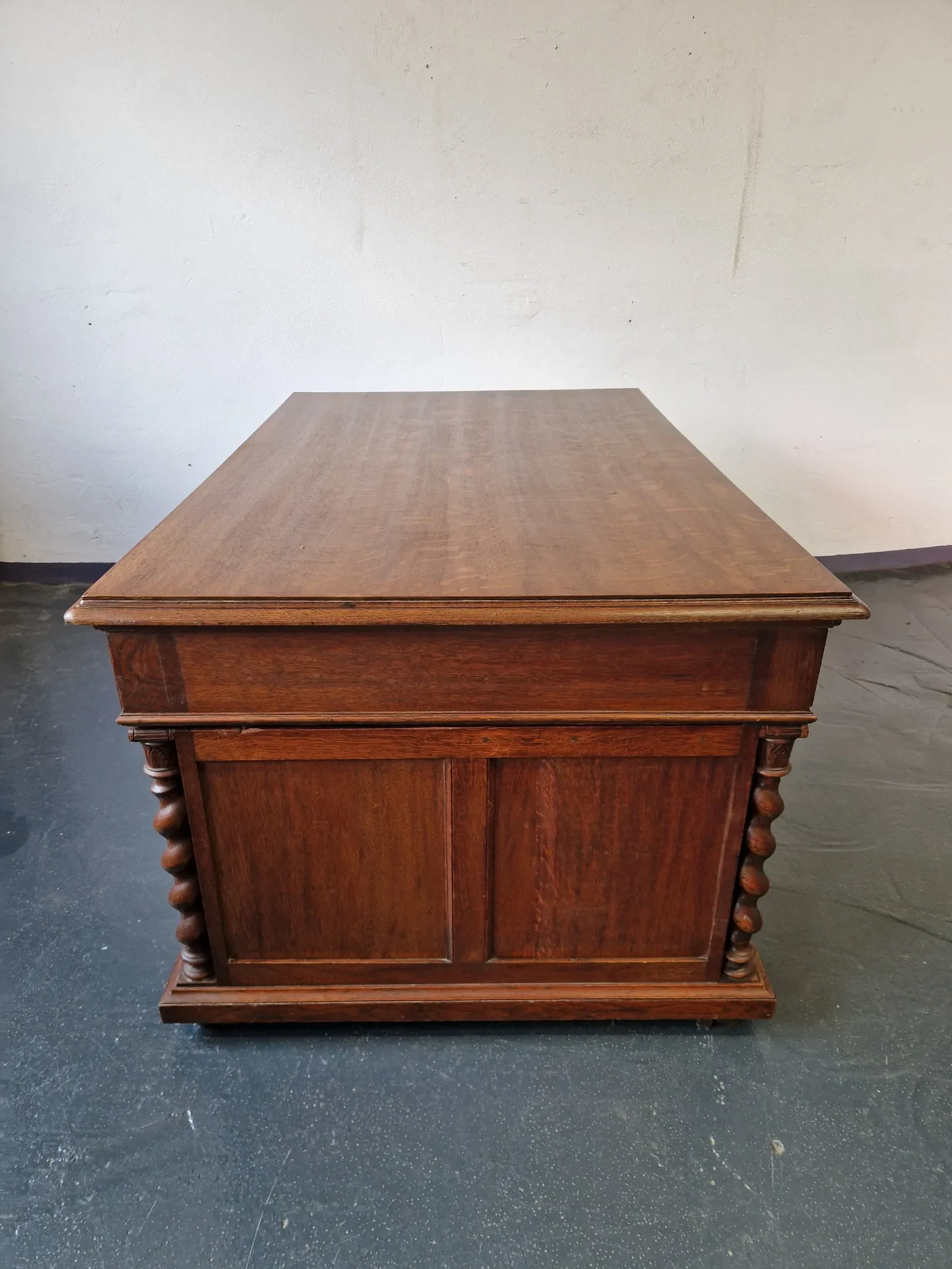 Das seltene Möbel ist freistehend, beidseitig nutzbar und verfügt über vier abschließbare Türen sowie sechs Schubladen – drei je Seite. Zwei passende Schlüssel sind erhalten. Der antiker Schreibtisch Doppelschreibtisch mit Ritter Schnitzereien wurde fachmännisch behandelt; minimale Spuren früheren Holzwurmbefalls sind inaktiv und Teil seiner Geschichte.