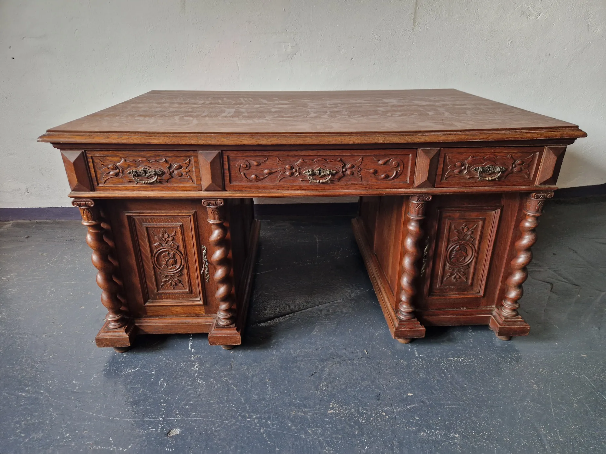 Ein prachtvoller antiker Doppelschreibtisch aus massivem Eichenholz mit feinen Schnitzereien und neu aufgearbeiteter Platte und edlen Bronzebeschlägen. Beidseitig nutzbar, mit vier Türen, sechs Schubladen und Schlüsseln – abschließbar und funktional.