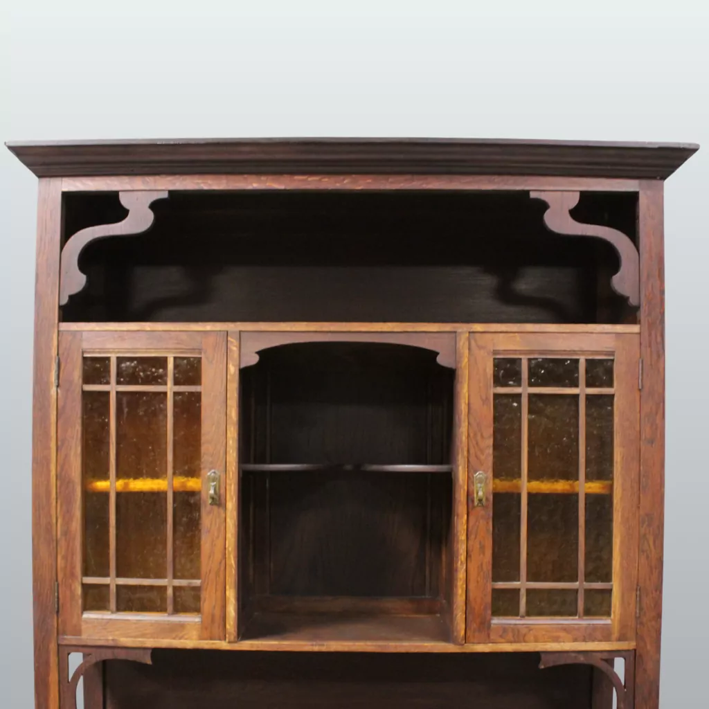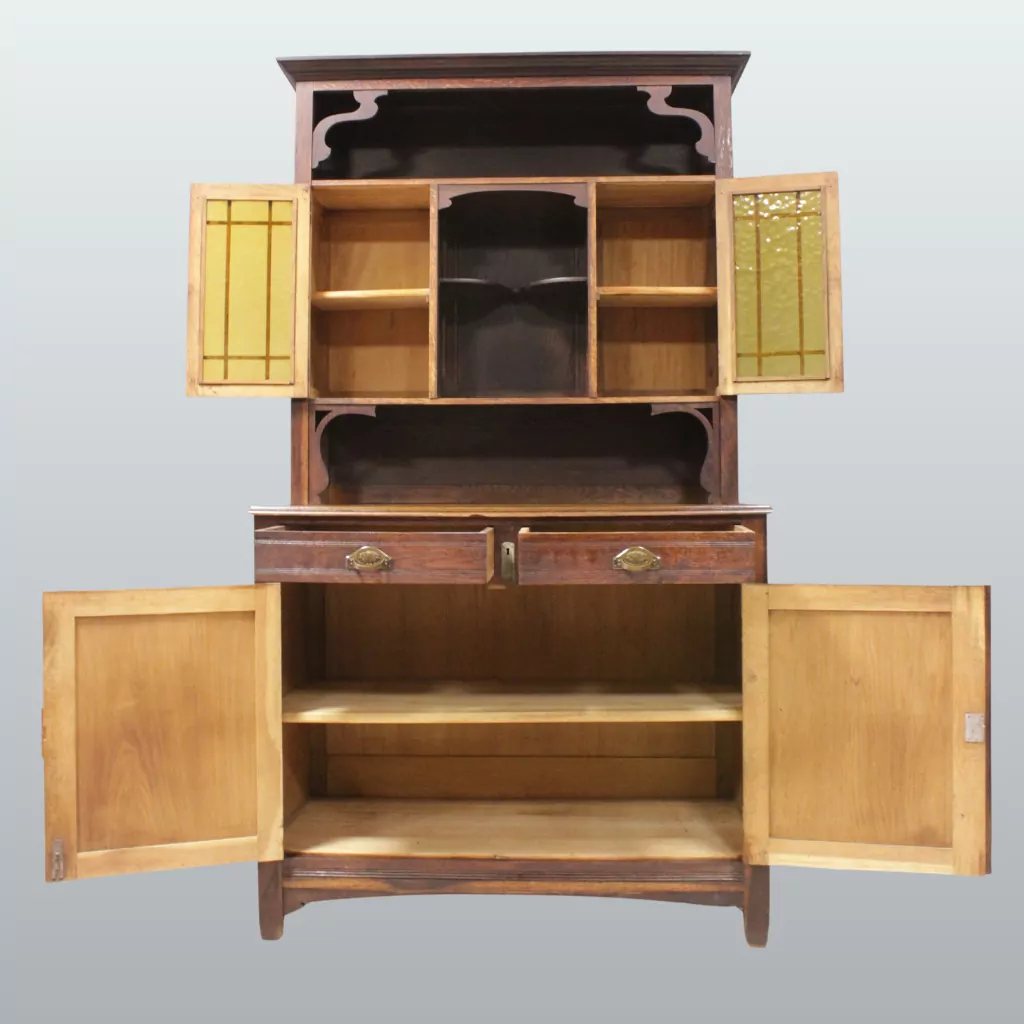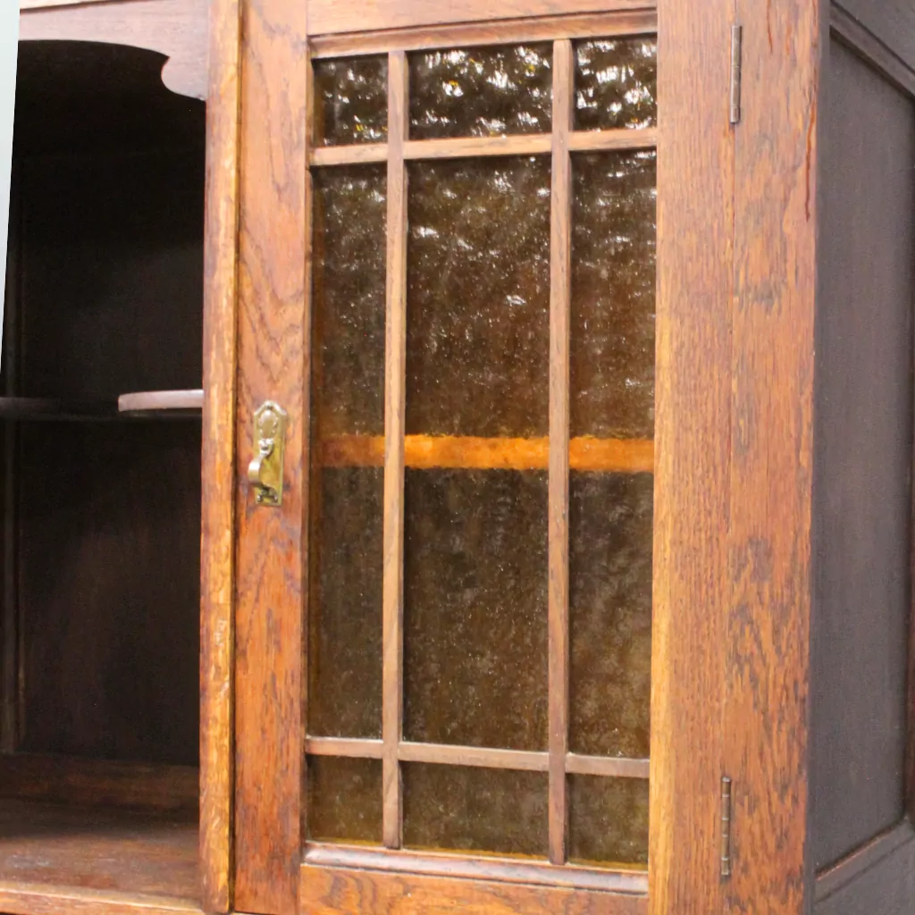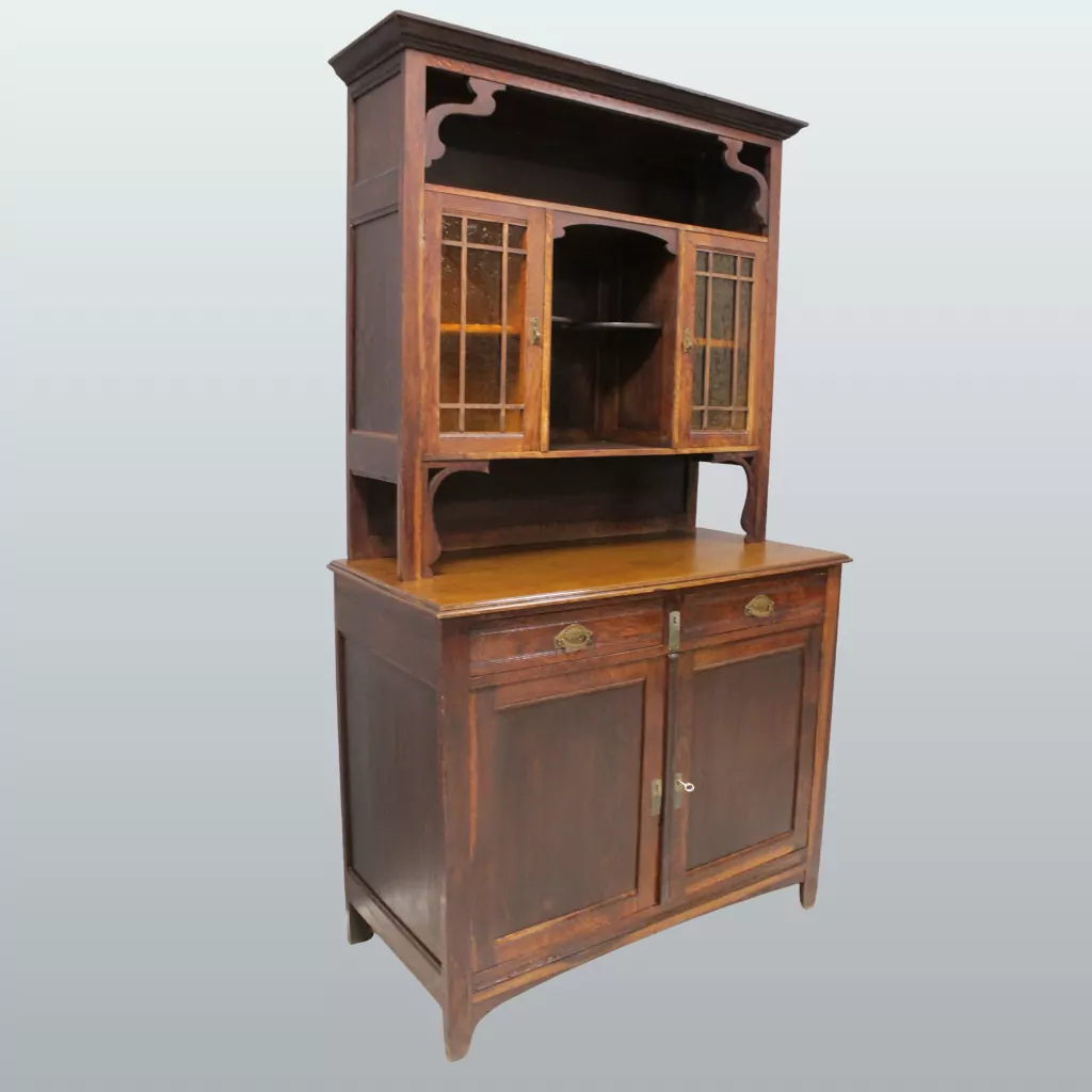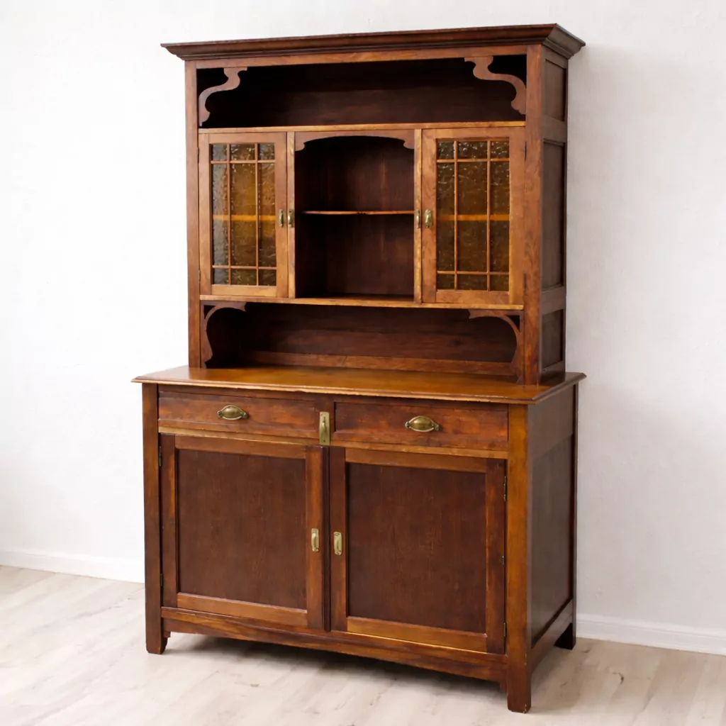 Neben seiner dekorativen Wirkung bietet das antike Buffet aus Eiche auch praktische Aufbewahrungsmöglichkeiten. Mehrere Türen, geräumige Schubladen und offene Ablageflächen schaffen großzügigen Stauraum für Geschirr, Gläser, Tischwäsche oder Dekorationsobjekte. Hinter den verglasten Türen lassen sich Lieblingsstücke stilvoll präsentieren, während die geschlossenen Fächer zusätzlichen Platz für alltägliche Dinge bieten. Dadurch eignet sich das Buffet sowohl als klassischer Küchenschrank als auch als stilvoller Buffetschrank im Esszimmer oder Wohnbereich. Antike Möbel aus Eiche sind nicht nur langlebig, sondern auch nachhaltig und wertbeständig. Dieses originale Jugendstil Buffet verbindet historische Handwerkskunst mit zeitloser Funktionalität und ist damit eine besondere Bereicherung für Liebhaber antiker Möbel, Vintage-Einrichtungen und hochwertiger Massivholzmöbel. Ein authentisches Einzelstück mit Charme, das Wohnräume aufwertet und über viele Jahre hinweg Freude bereitet.