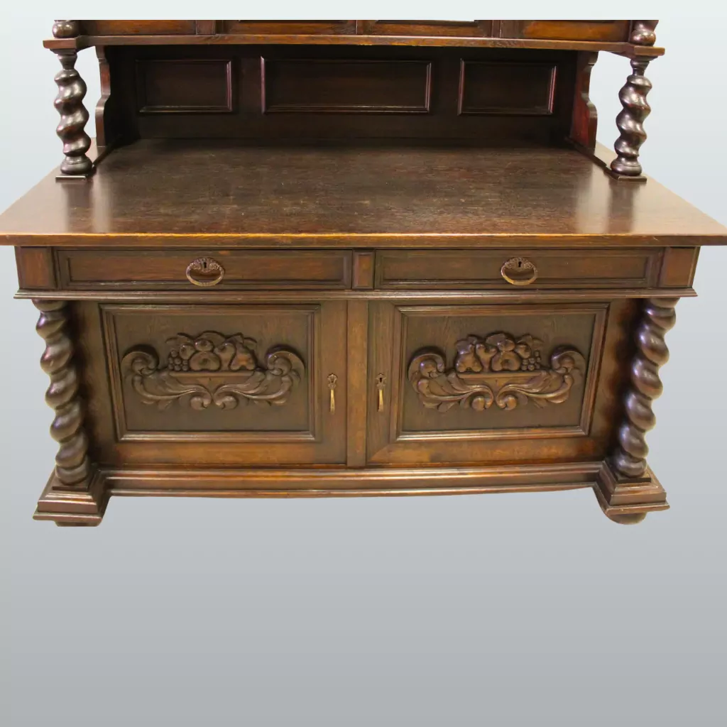Dieses beeindruckende antike Danziger Barock Buffet aus der Zeit um 1860 vereint handwerkliche Meisterkunst, repräsentative Ausstrahlung und zeitlose Eleganz. Gefertigt aus massiver Eiche und teilweise furniert, spiegelt der monumentale Buffetschrank die hohe Qualität und Detailverliebtheit historischer Möbeltradition wider. Reich geschnitzte Frucht- und Weinranken im plastischen Hochrelief zieren die Front und verleihen dem Möbel eine besonders lebendige, dreidimensionale Wirkung.