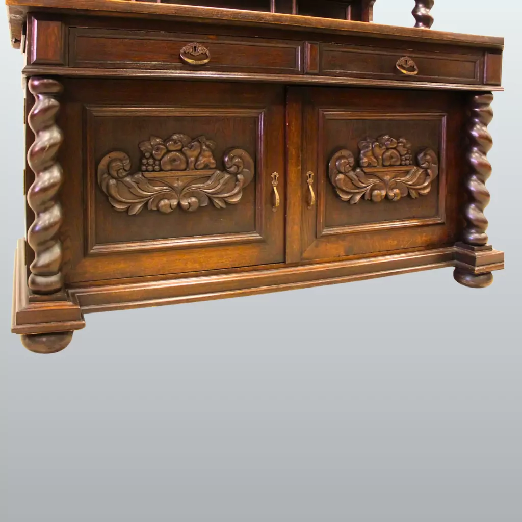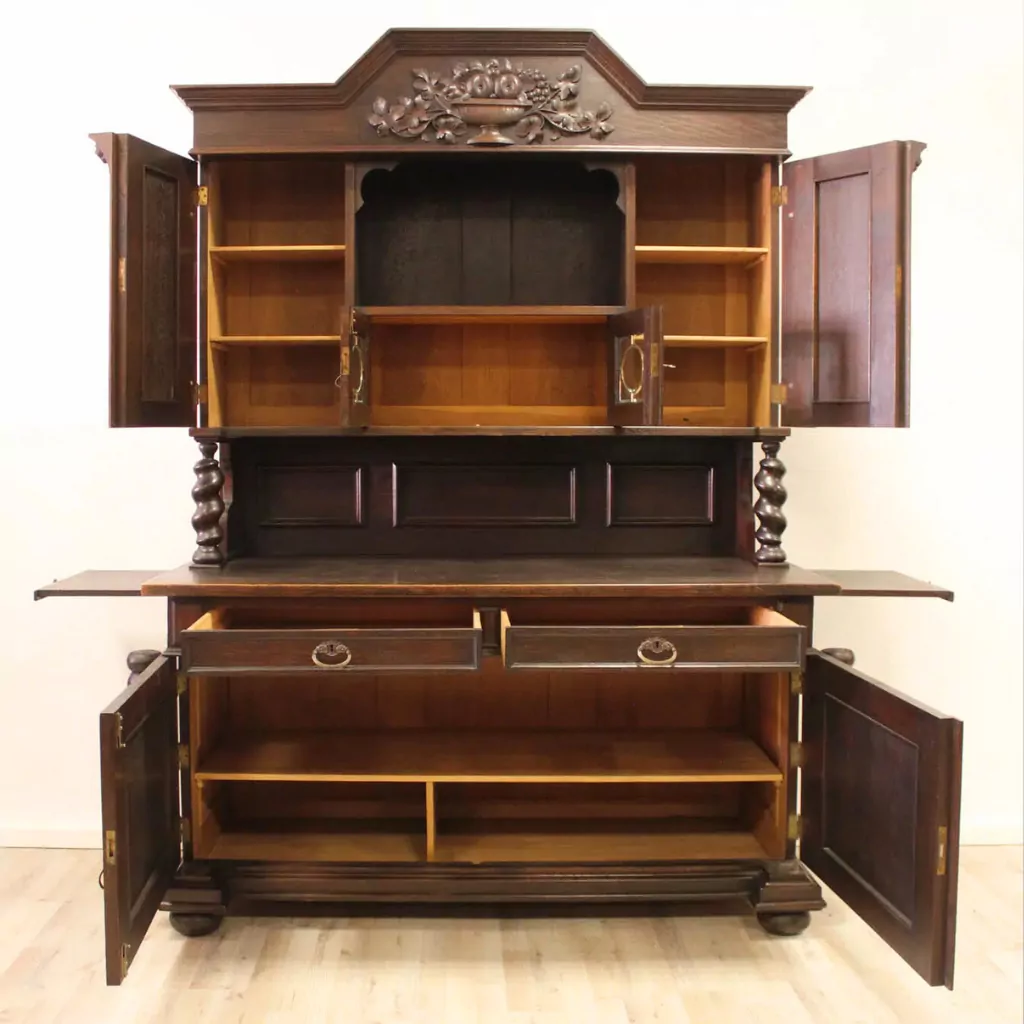 Besonders praktisch sind die seitlichen Ausziehplatten, die bei Bedarf zusätzliche Abstellfläche schaffen – ein hochwertiges Detail, das auf die gehobene Ausstattung solcher historischen Buffets hinweist. Der Schrank ist zudem in mehrere Teile zerlegbar, was Transport und Aufstellung deutlich erleichtert und ihn auch für moderne Wohnsituationen attraktiv macht.