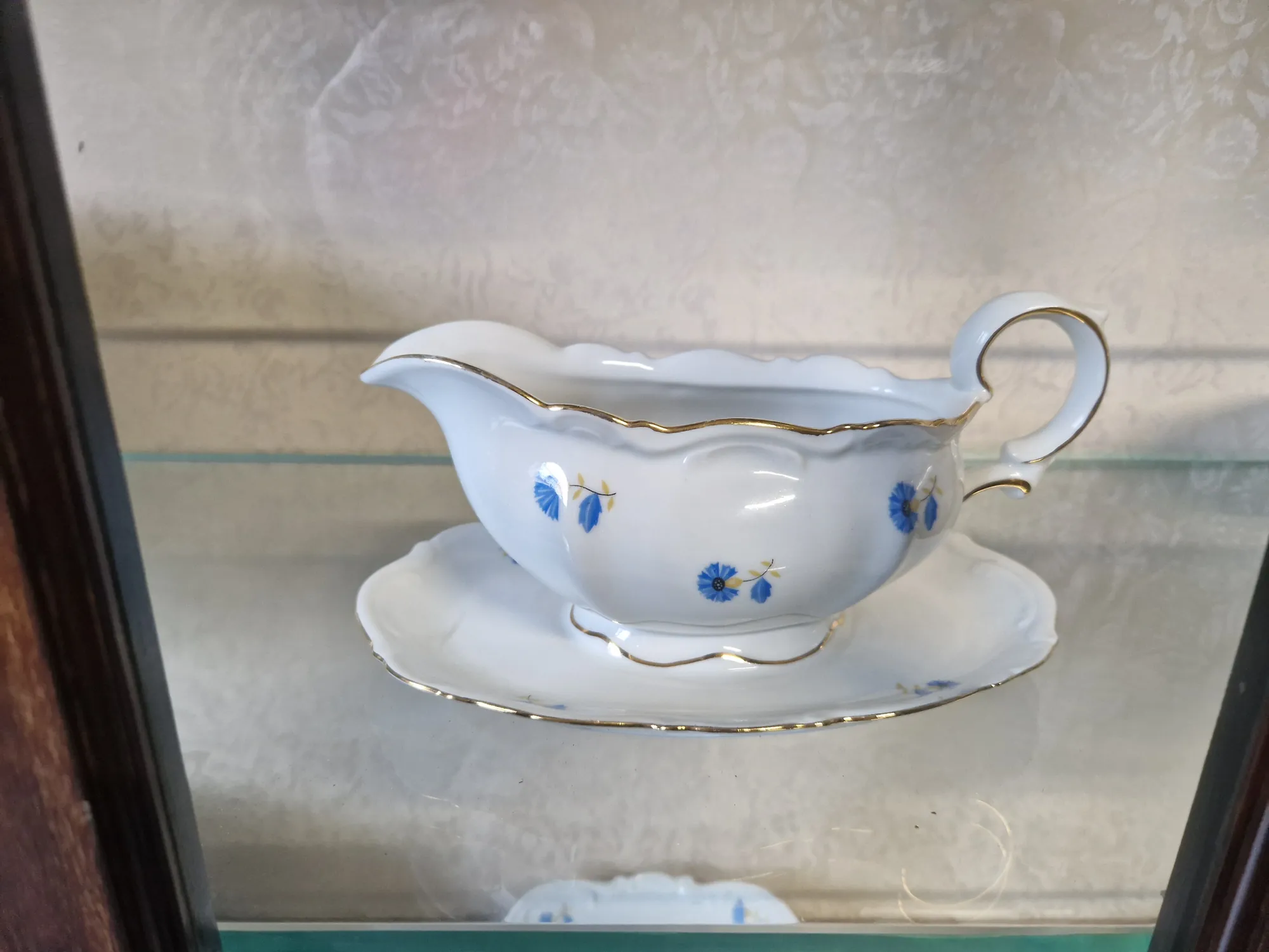 Dieses kostbare antike Porzellan Service stammt aus der traditionsreichen Porzellanfabrik Mitterteich Bavaria, bekannt für ihre feine Glasur, klassische Linienführung und detailreiche Dekore. Der zarte blaue Kornblumendekor in Kombination mit einem glänzenden Goldrand verleiht jedem Stück eine elegante Leichtigkeit. Die harmonische Farbgebung und feine Formgebung machen das Ensemble zu einem Highlight für Sammler, Liebhaber gehobener Tischkultur und stilvolle Tafeldekoration.
