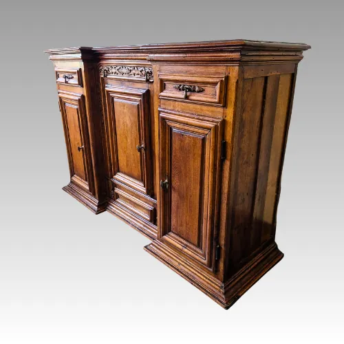Ein besonderes Merkmal dieses antiken Sideboards aus Eiche ist die kompromisslos massive Bauweise. Das Möbel ist nicht zerlegbar und wurde als stabiles Ganzes gefertigt, was seine hohe Langlebigkeit unterstreicht. Die handgeschnitzten, erhabenen Ornamente verleihen der Anrichte eine hochwertige und plastische Wirkung und wurden nicht maschinell, sondern traditionell ausgearbeitet. Ergänzt wird das Erscheinungsbild durch originale Eisenbeschläge und robuste Eisenscharniere, die dem Möbel nicht nur optischen Charakter, sondern auch funktionale Stabilität verleihen. Alle Türen lassen sich über einen klassischen Dreh-Verriegelungsmechanismus sicher verschließen – ein typisches Detail historischer Qualitätsmöbel. Aufgrund des hohen Gewichts wird der Transport mit mindestens vier Personen empfohlen.