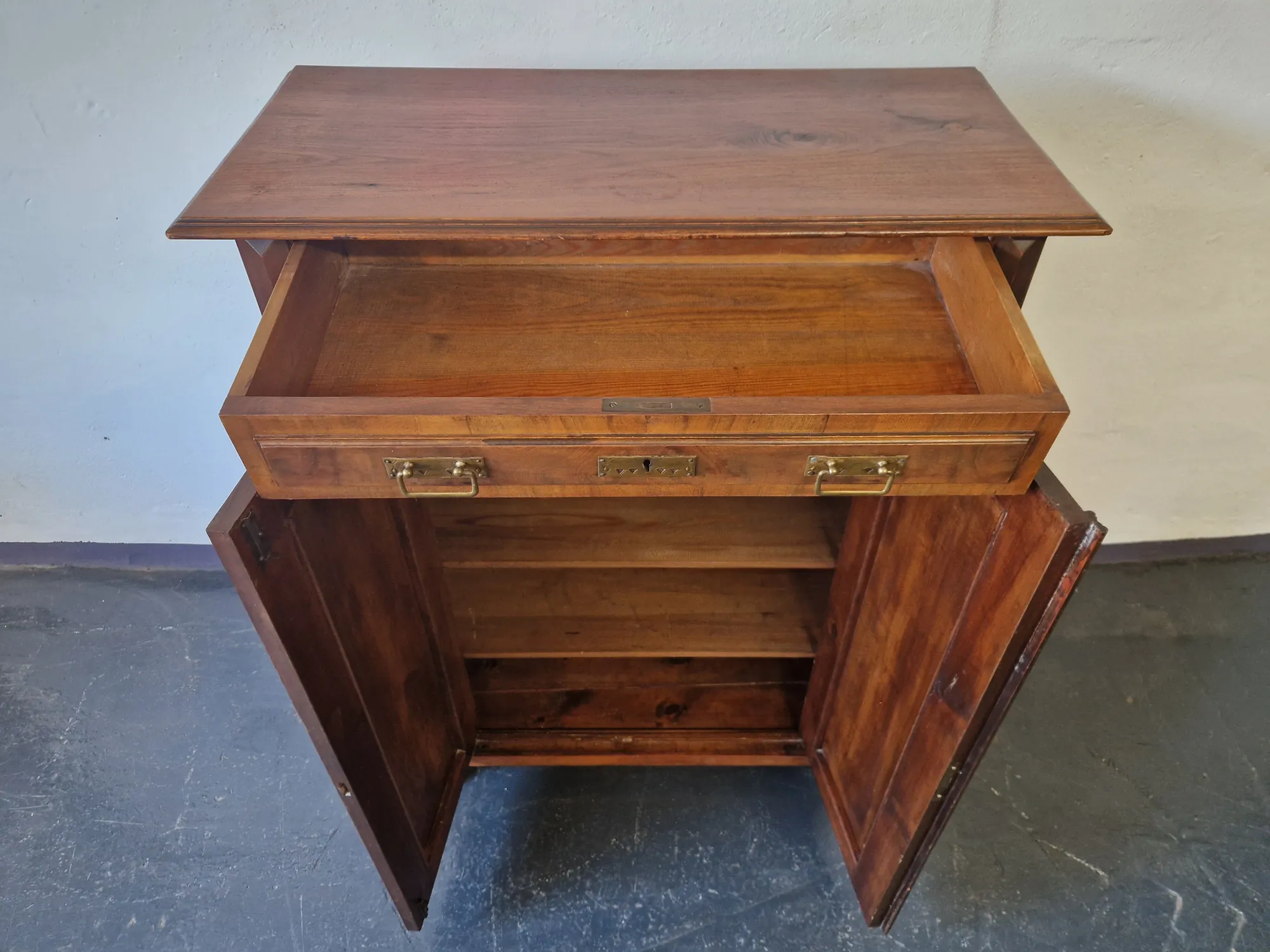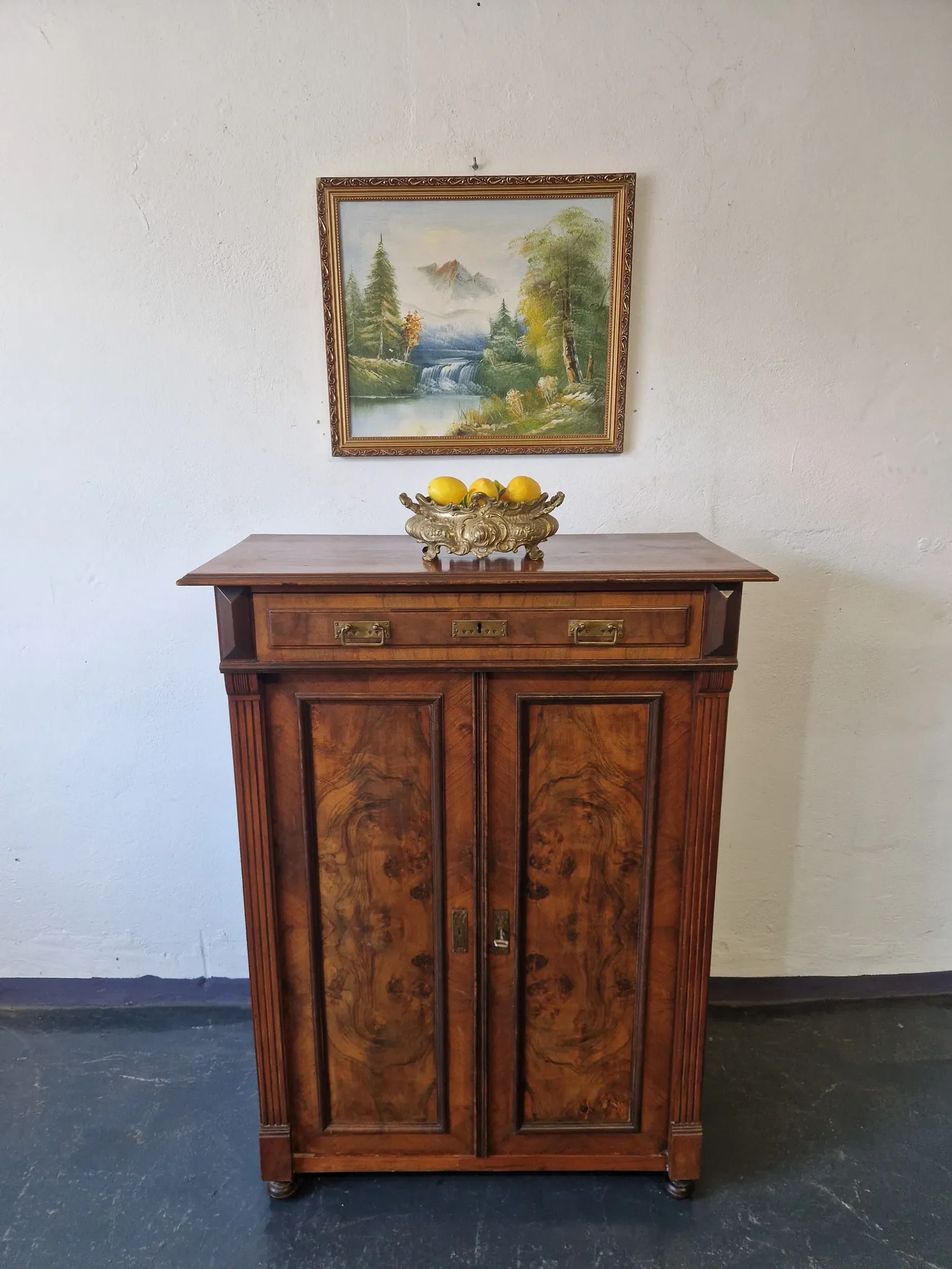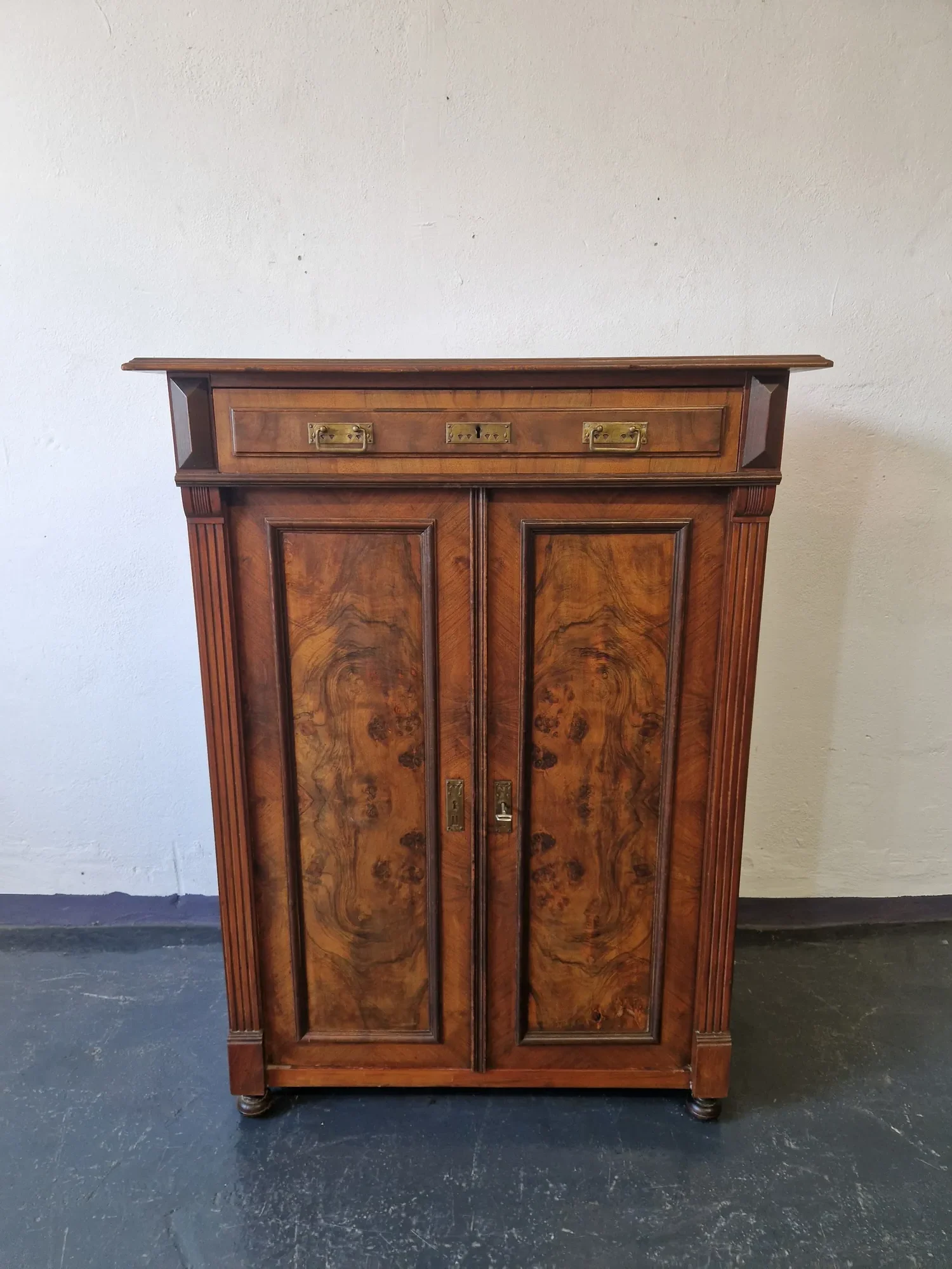 Stilvolles antikes Jugendstil Vertiko um 1900 aus Nussbaumfurnier und Weichholz. Zwei Türen, eine Schublade und ein funktionierendes Schloss mit Messingbeschlägen. Ein echtes Einzelstück mit Charme und Charakter.