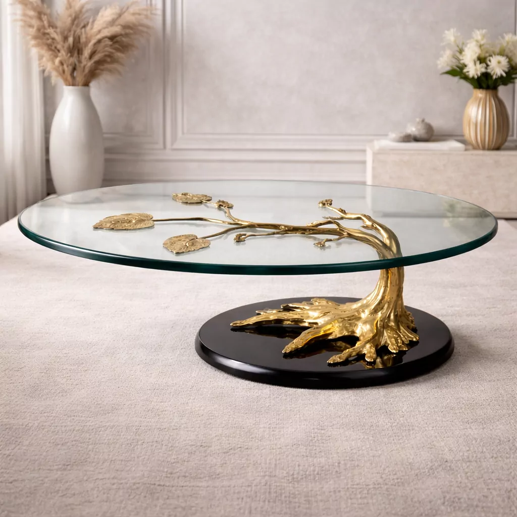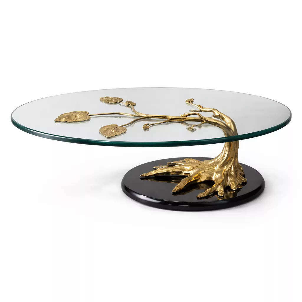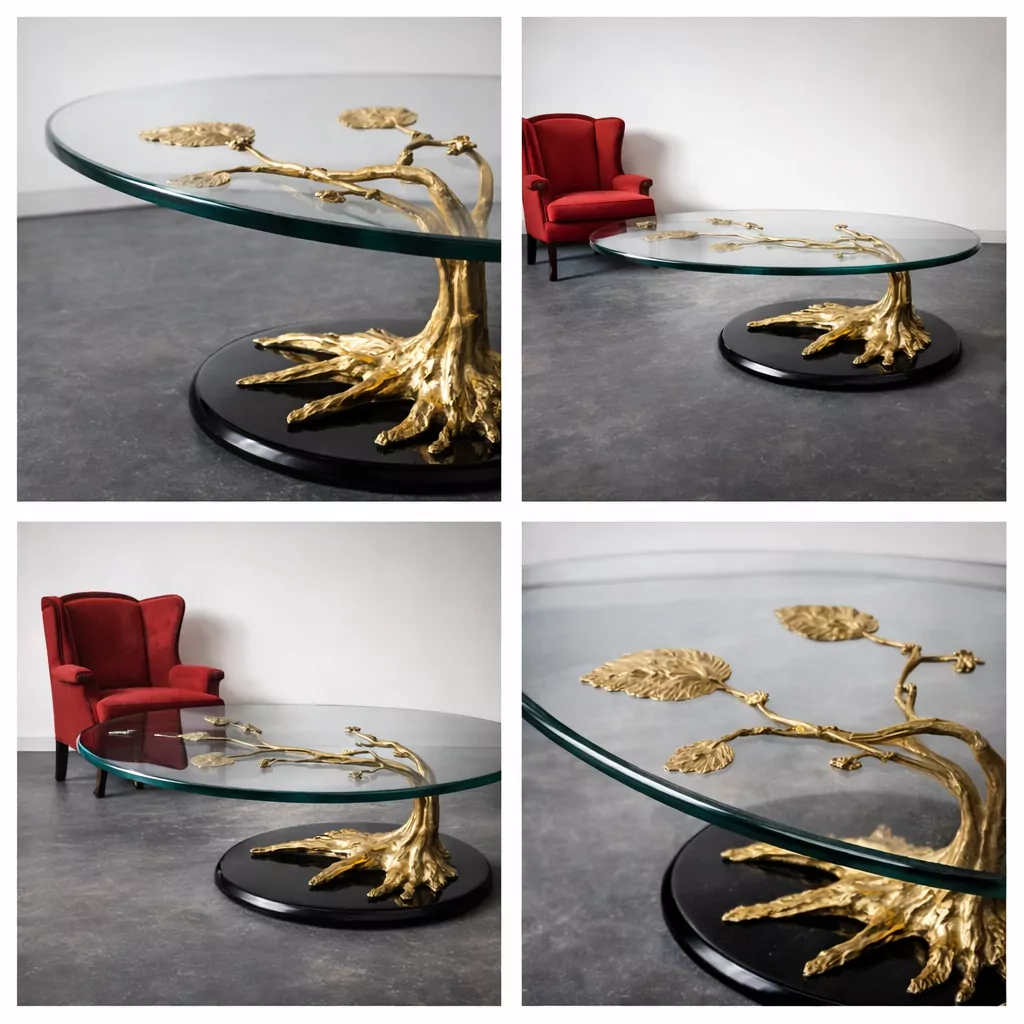Die ovale Glasplatte ergänzt das Untergestell perfekt. Sie ist klar und reduziert gestaltet, sodass die skulpturale Form des Messingbaums im Mittelpunkt steht. Gleichzeitig verleiht das Glas dem Tisch eine gewisse Leichtigkeit und macht ihn vielseitig kombinierbar. Ob mit modernen Sofas, klassischen Sitzmöbeln oder minimalistischen Interieurs – dieser Couchtisch aus Messing und Glas fügt sich harmonisch ein und setzt dennoch ein starkes Statement.