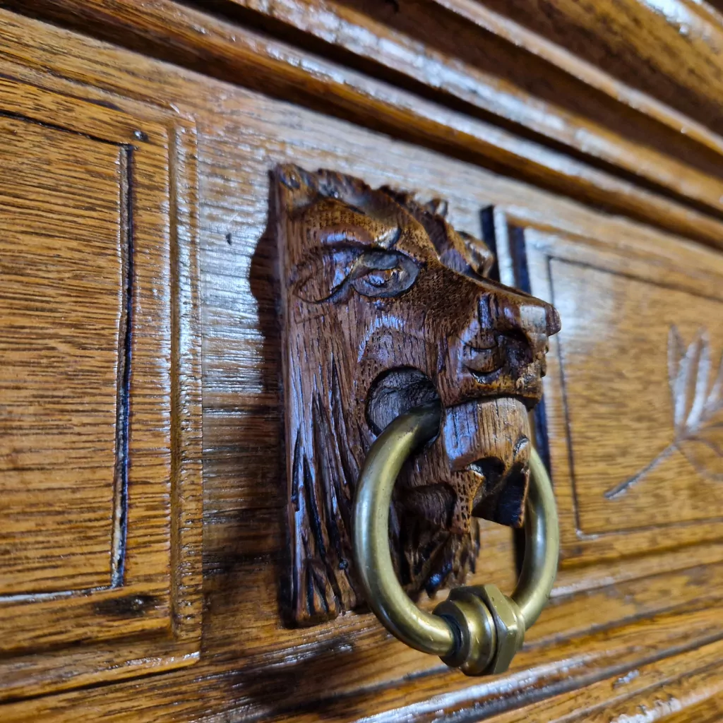 Besonders auffällig sind die handgeschnitzten Löwenköpfe mit Messingringen im Maul. Diese waren in der Gründerzeit ein beliebtes Symbol für Stärke, Wertigkeit und Beständigkeit. Die originalen Messingbeschläge unterstreichen den hochwertigen Charakter des Möbels und passen harmonisch zum warmen Farbton der Eiche.