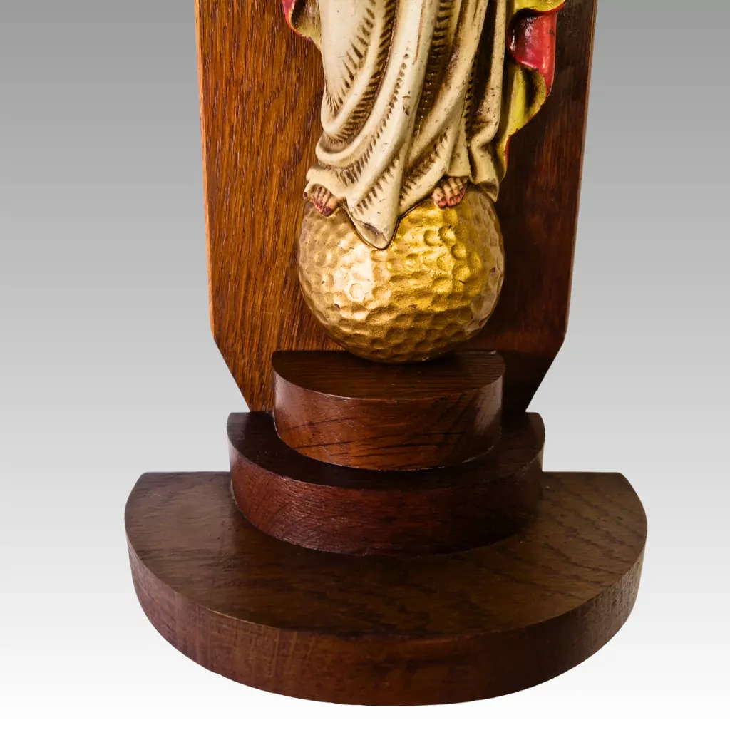 Der Sockel und die Rückwand bestehen aus massiver Eiche, einem langlebigen und wertigen Holz. Eiche wurde um 1900 bevorzugt für religiöse Objekte verwendet, da sie für Beständigkeit und Stärke steht. Der Hausaltar ist zweiteilig, bestehend aus Holzsockel und Figur, was eine sichere Befestigung ermöglicht.