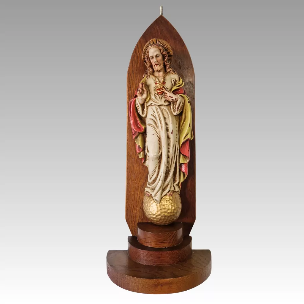 Der Herz Jesu Hausaltar besteht aus einer handbemalten Gipsfigur und einem stabilen Sockel aus massiver Eiche. Die Kombination aus fein ausgearbeiteter Figur und edlem Holz verleiht dem Objekt eine warme und würdevolle Ausstrahlung. Durch seine Größe von 42 cm Höhe wirkt dieser Hausaltar präsent, aber nicht überladen, und eignet sich sowohl für kleine Altäre als auch für Wohnräume.