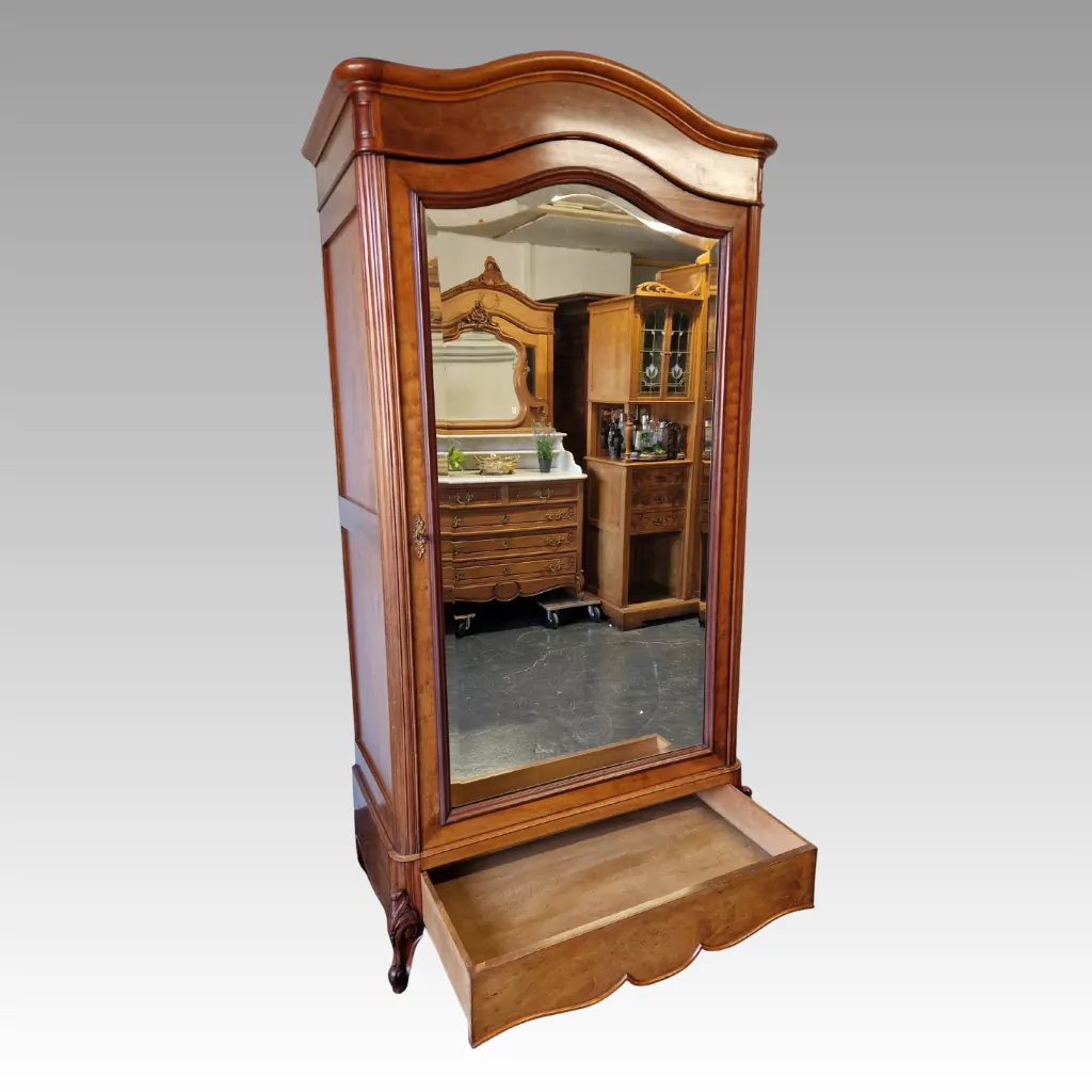 Die schwere Spiegeltür zeugt von der massiven Bauweise und der hohen Materialqualität. Trotz ihres Gewichts schließt sie sicher und elegant, getragen von stabilen Scharnieren, die perfekt zur Epoche passen.