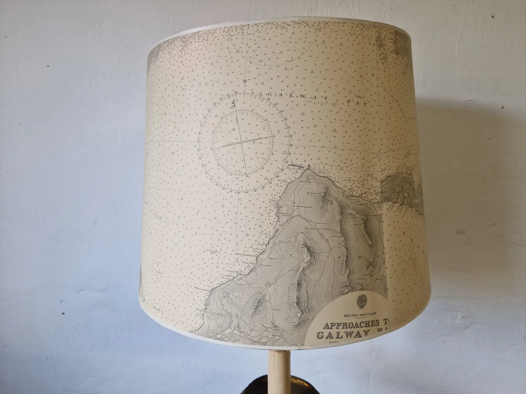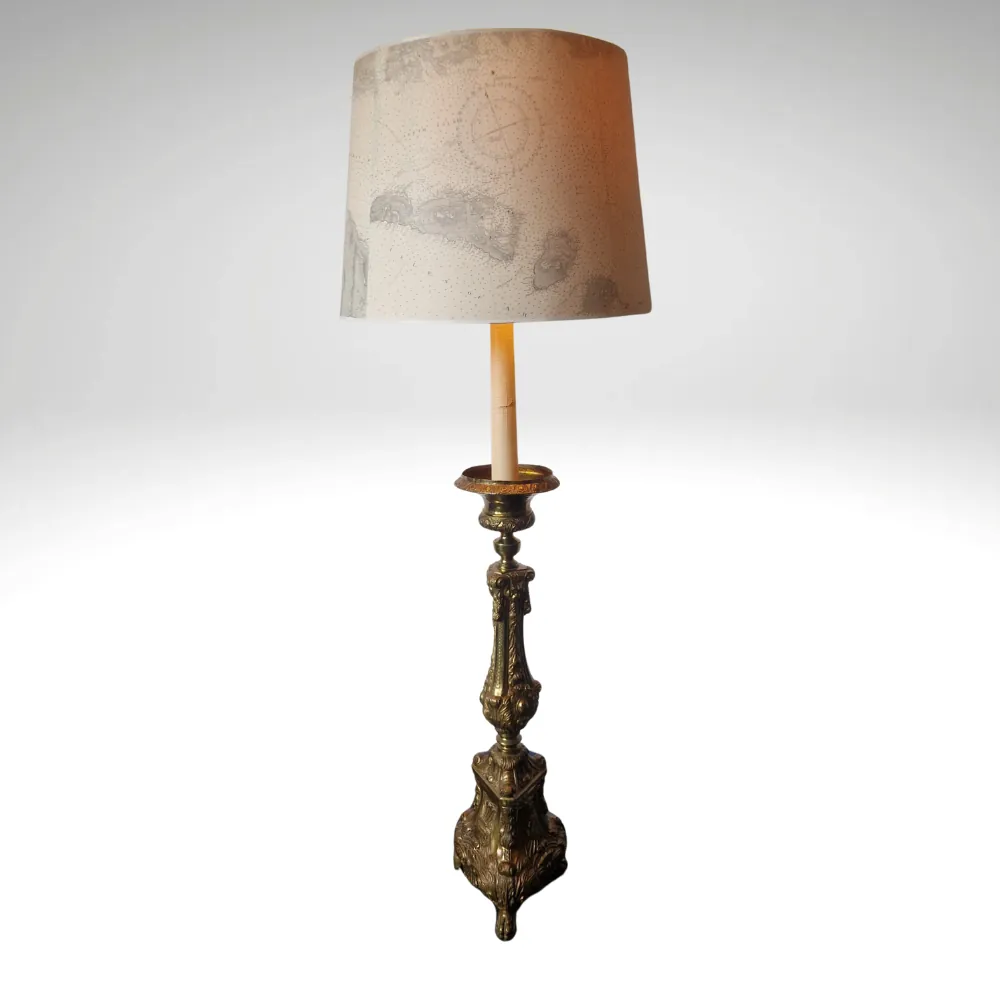 Die antike, schwere Stehlampe aus Messing besitzt einen dicken, bedruckten Papierschirm, der abnehmbar ist. Die Lampe ist nicht zerlegbar, steht aber sehr stabil. Sie ist geprüft und voll funktionsfähig.