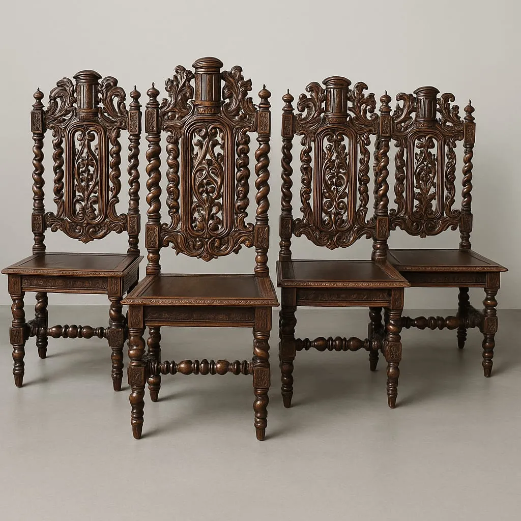 Jeder Stuhl ist ein Unikat – stabil, detailreich und voller Charakter. Die gewachsene Patina betont die Tiefe des Holzes und verleiht jedem Stück eine einzigartige Ausstrahlung. Dieses Set aus 8 antiken Renaissance Stühlen ist nicht nur ein Sitzmöbel Ensemble, sondern ein authentisches Zeugnis barocker und Renaissance Handwerkskunst, das jede Sammlung, jedes historische Interieur oder repräsentative Esszimmer zu einem Ort mit Geschichte macht.