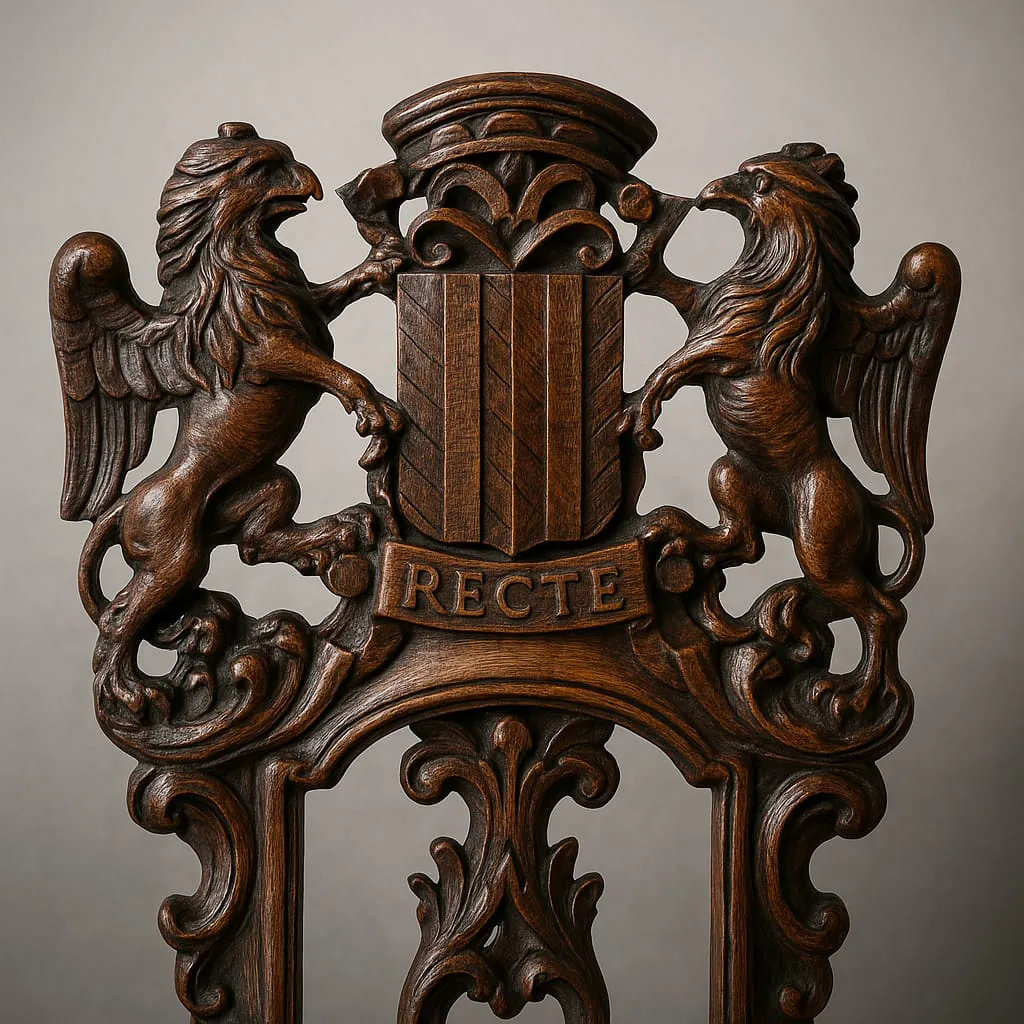 Ein seltenes Set aus 8 prachtvollen antiken Renaissance Stühlen, gefertigt aus massivem, dunkel patiniertem Hartholz. Ihre hohe Rückenlehne wird von zwei majestätischen Greifen flankiert, die ein fein geschnitztes Wappen mit der lateinischen Inschrift „RECTE“ umrahmen – ein Symbol für Aufrichtigkeit, Recht und Stärke.